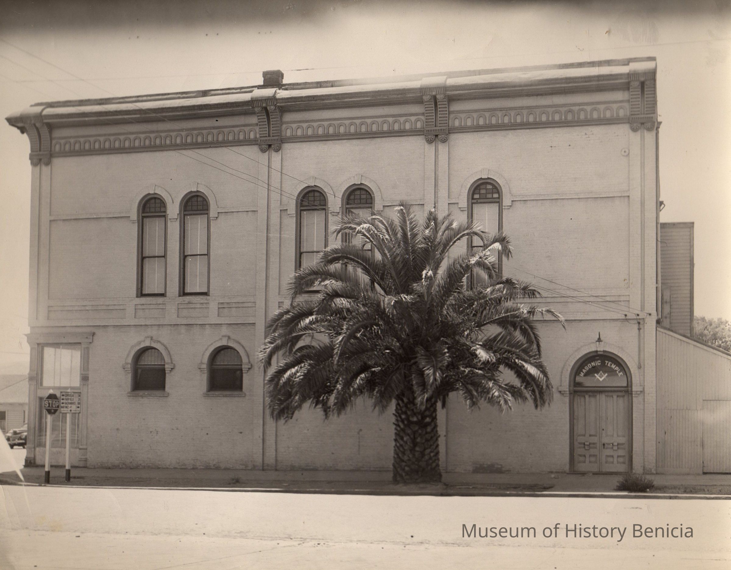 B/W photo of Masonic Temple at First and J Streets, the side facing East J Street is shown. Building was built in 1887.