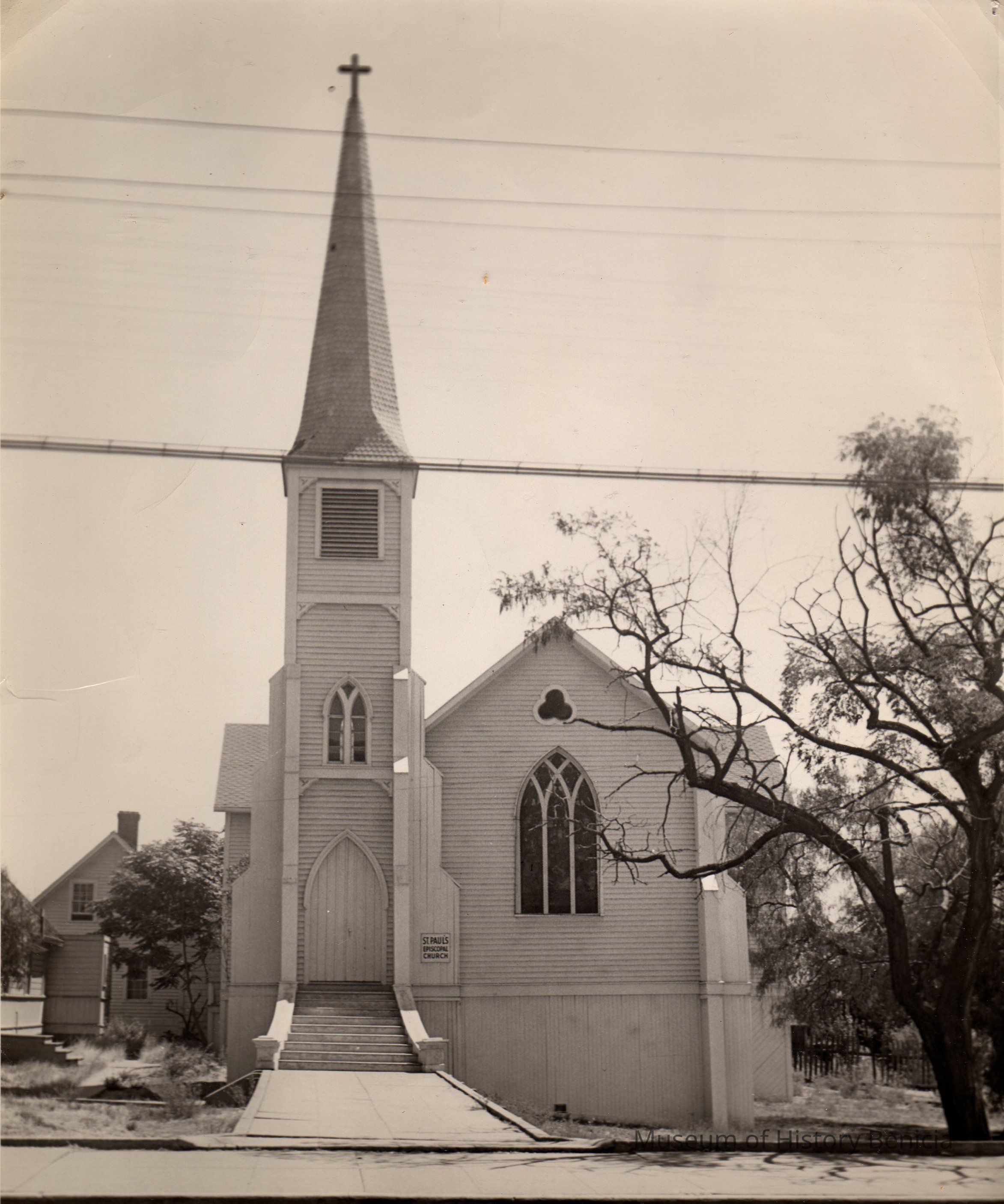 B/W view of St. Paul's Episcopal Church from First Street, showing the old entrance facing First Street.