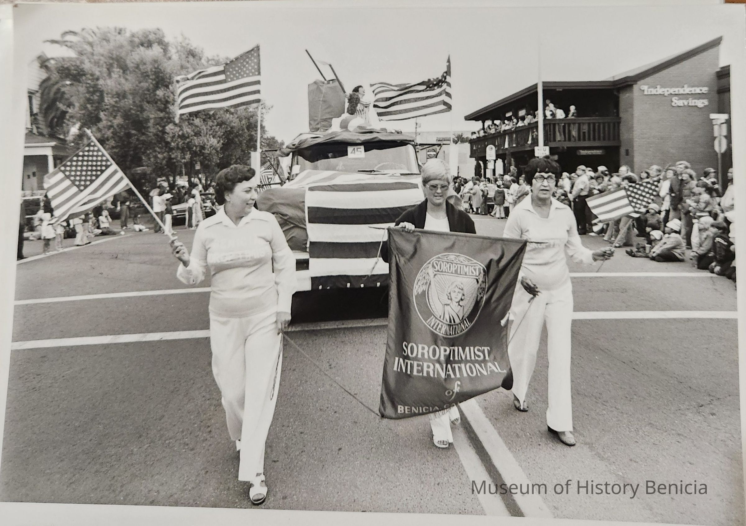 B/W Photograph from the 1979 Third of July Torch Light/First Annual Sister City Celebration Parade. The parade route was from the foot of First Street to the City Park. In This photograph the three ladies are walking in front of a "float" sponsored by the Soroptimist International group. The woman on the left is Joann Hayes, the one in the middle with the banner is Leeann Cawley and the one on the right is Callie Leonard.Photograph Details