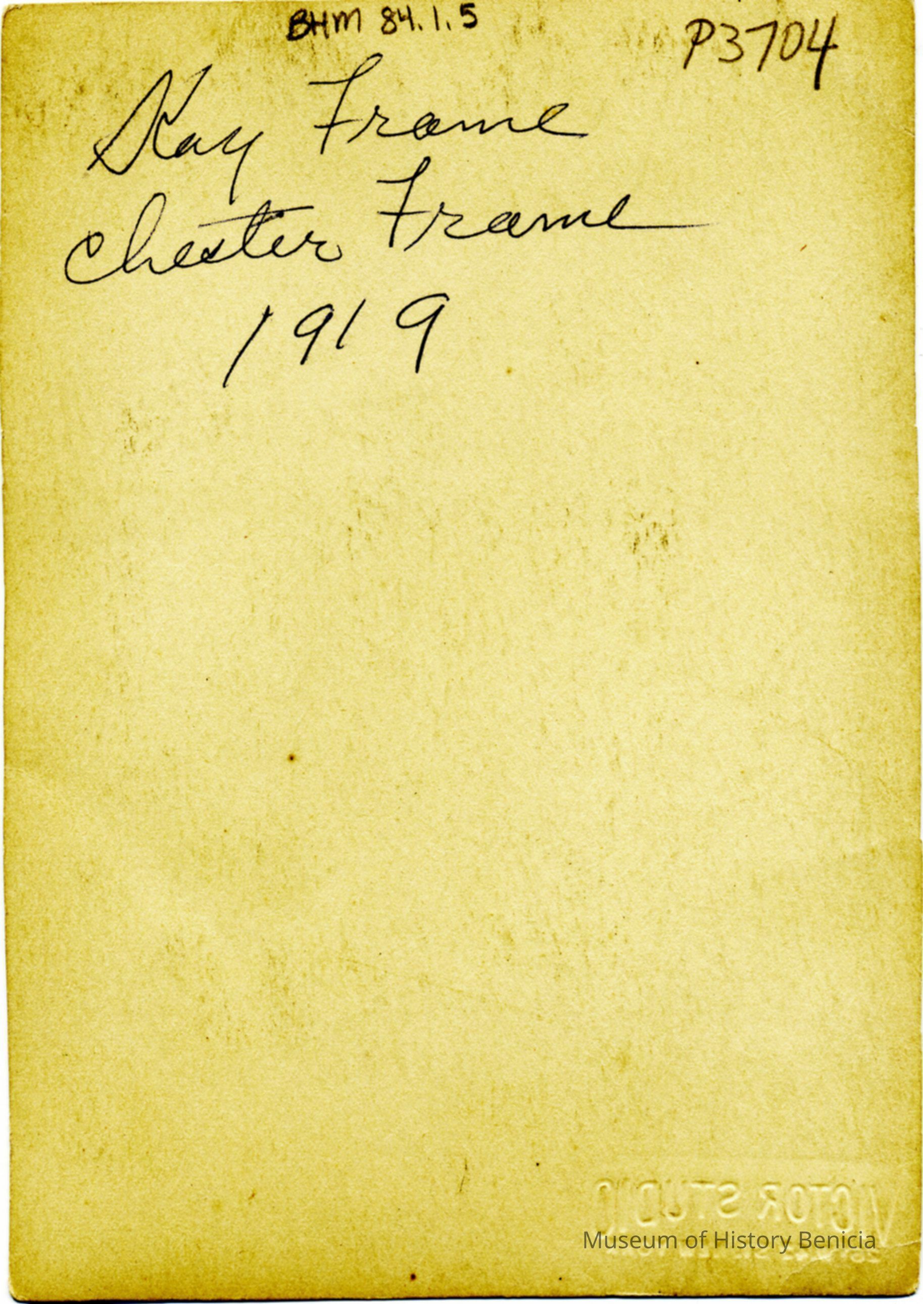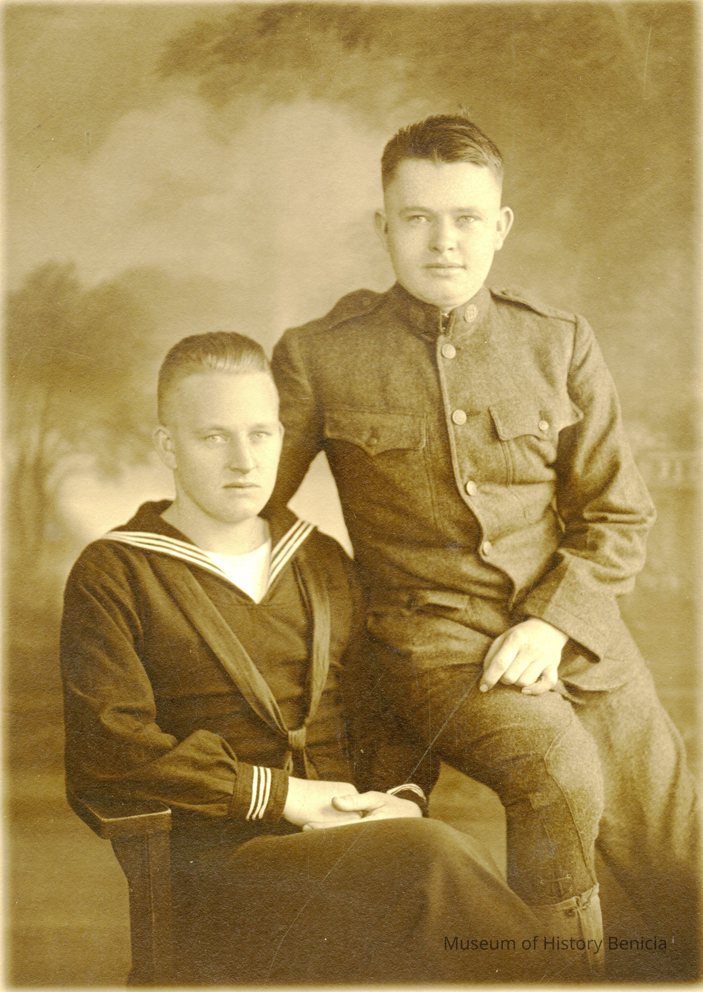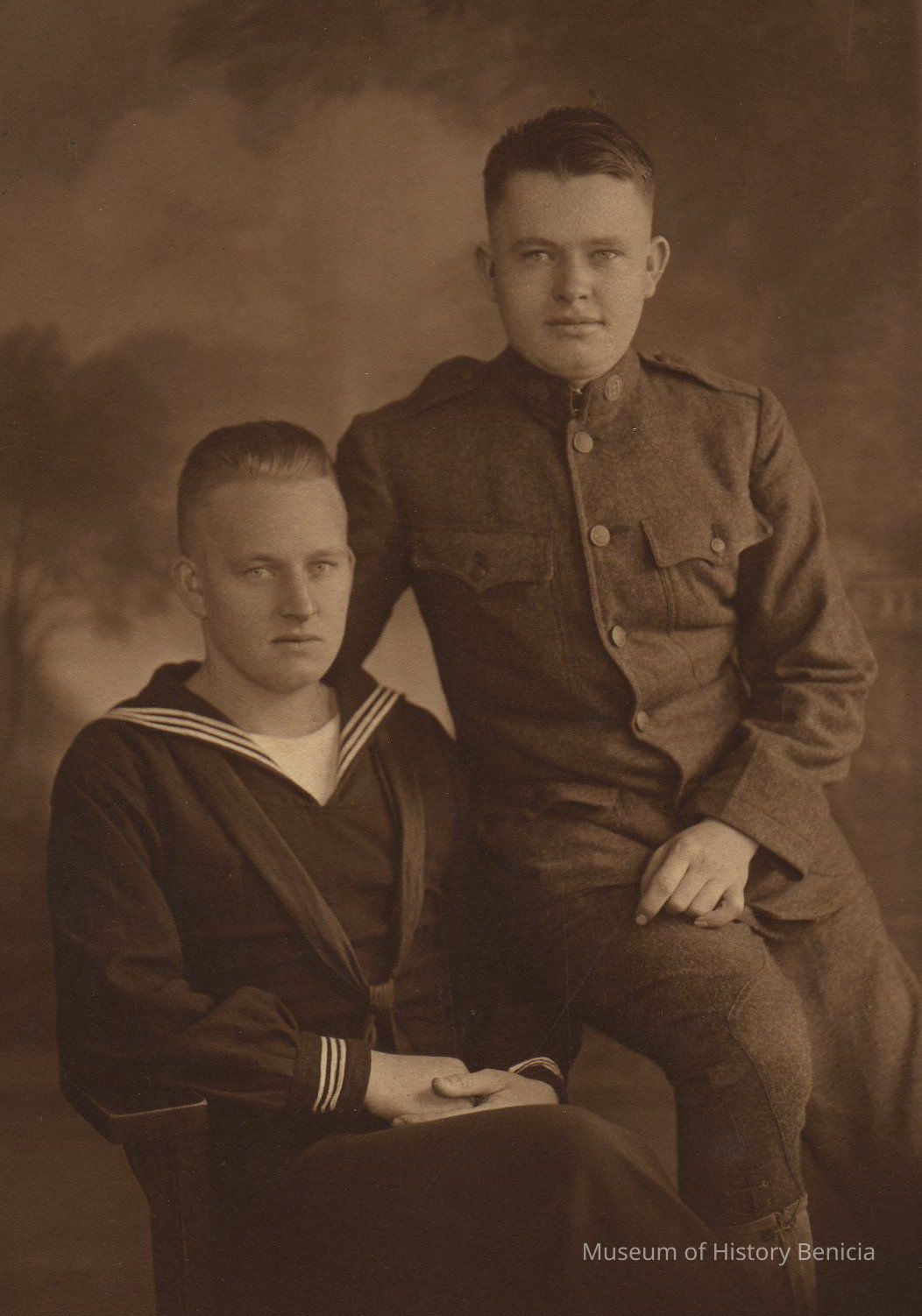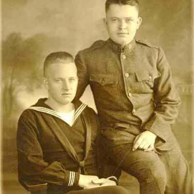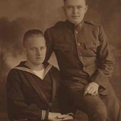 B/W (more sepia toned) photo of brothers Kay and Chester Frame in World War I uniforms. Related to the McKay family. Kay had a shoe store on First Street. Chester ("Pete") had an ice cream store on First Street.Collection