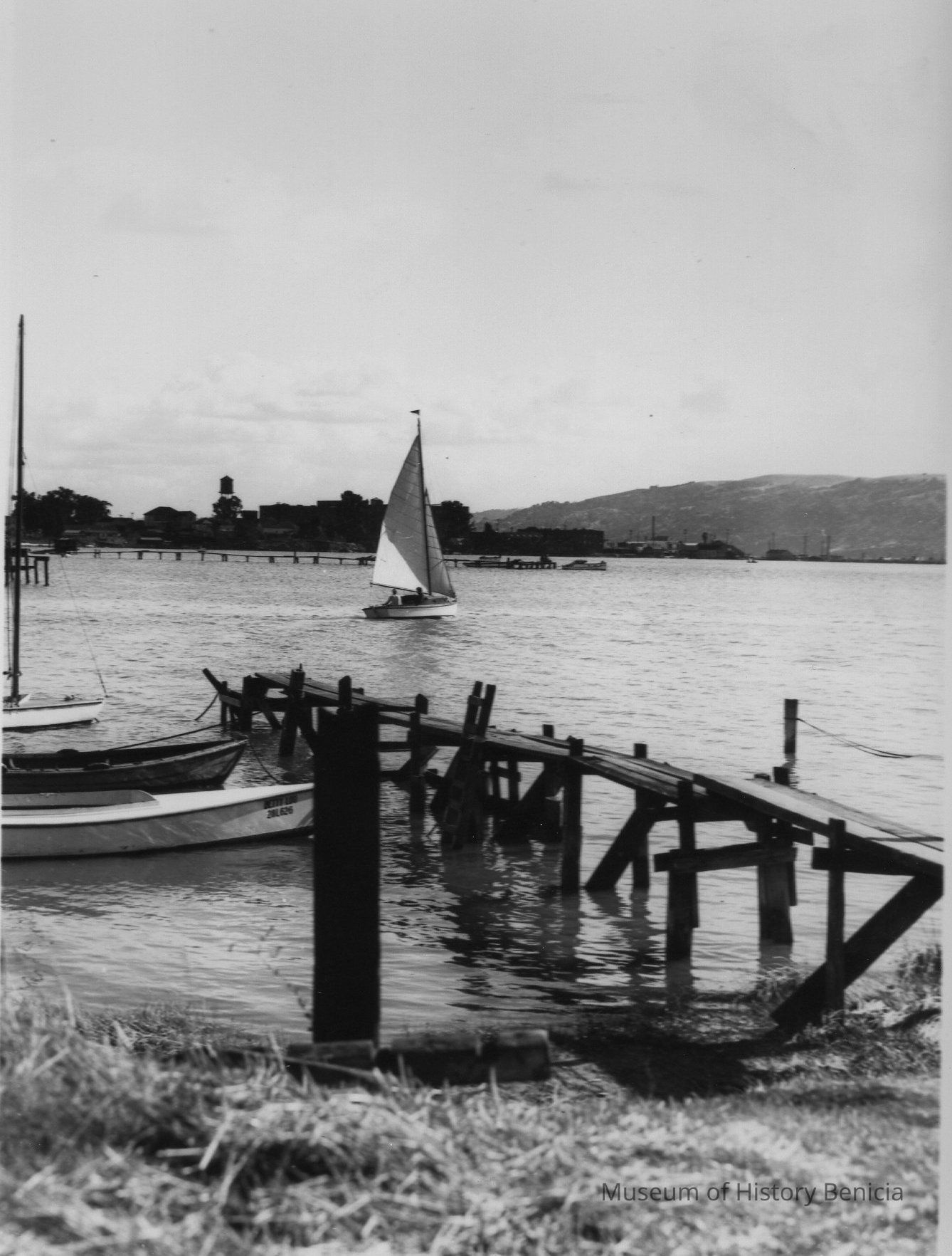 B/W photo of sailboat on the Carquinez Straits as seen from the Benicia waterfront, looking eastward toward the West Second Street area.Collection