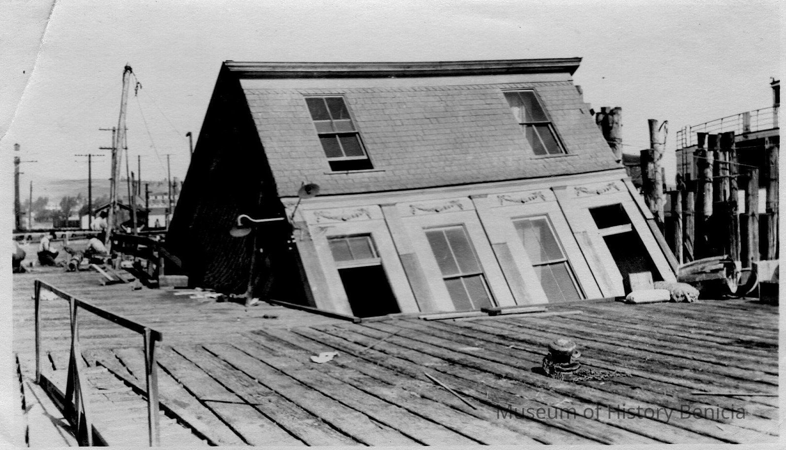 B/W photograph. Rotted decking caused the Wharfinger House to fall into the water. Nobody was home at the time, they had gone shopping. (see also 2000.100.0035)