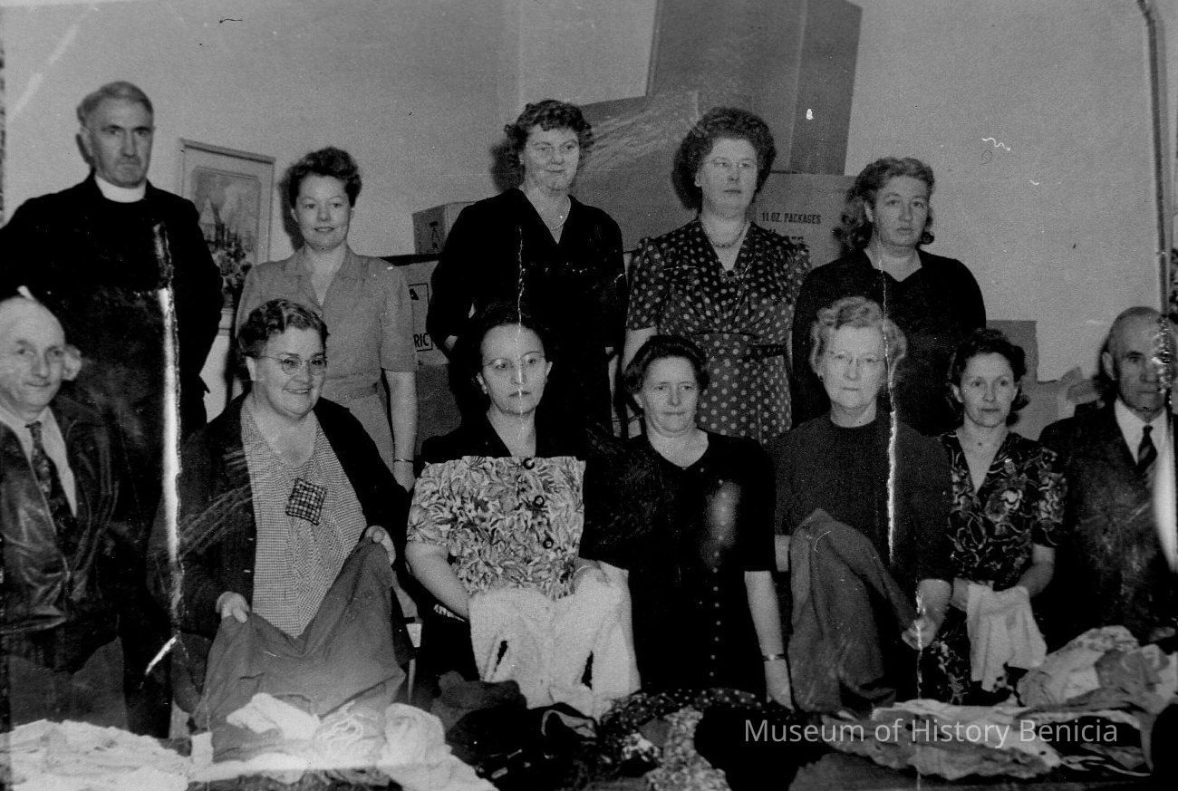 B/W Photograph: This photograph appeared in the January 31, 1946 edition of the Benicia Herald - New Era newspaper. Committee Clothing Drive:. First row L-R: Steven DeBenedetti, Miss Ada Perry, Mrs. Marie Silva, Mrs. Irene Bowen, Mrs. LaVeta Byerrum, President Benicia Womens Community Club; Mrs. Loren Wood, Mr. R. H. Mann. Second row L-R: Father Albert Muller O.P., Mrs. G. Ising, Mrs. Ray Bahrenburg, Mrs. Mabel Hunter, Mrs. Wm. Clark. Headquarters, Congregational Church.Collection