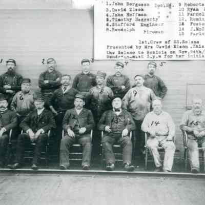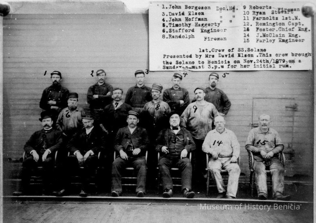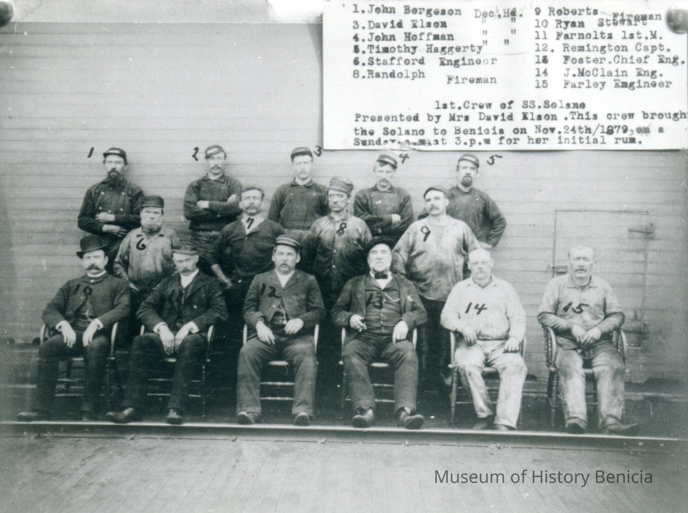 B/W photograph: Crew members of the S. S. Solano. All men are identified in photo: "1. John Bergeson. 3. David Elson. 4. John Hoffman. 5. Timothy Haggerty. 6. Stafford Engineer. 8. Randolph Fireman. 9. Roberts Fireman. 10. Ryan Stewart. 11. Farnoltz 1st. M. 12. Remington Capt. 13. Foster. Chief Engineer. 14. J. McClain Eng. 15. Farley Engineer. First . Crew of SS . Solano. Presented by Mrs David Elson. This crew brought the Solano to Benicia on Nov. 24th/1879, on a Sunday a.m. at 3 p.m. for her initial run."Collection