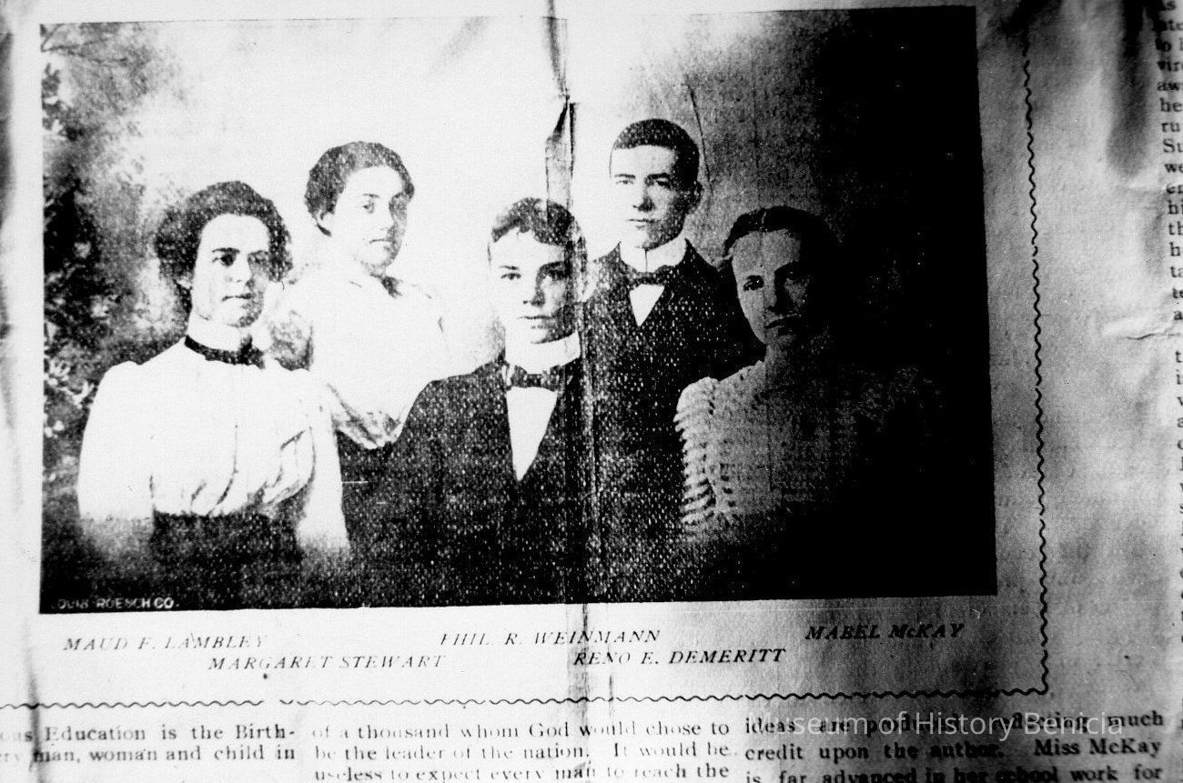 B/W photograph of a book or newspaper article: Maud Lambley, Phil Weinmann, Mabel McKay, Margaret Stewart, Reno DeMerritt-- Pioneers of Benicia.Collection