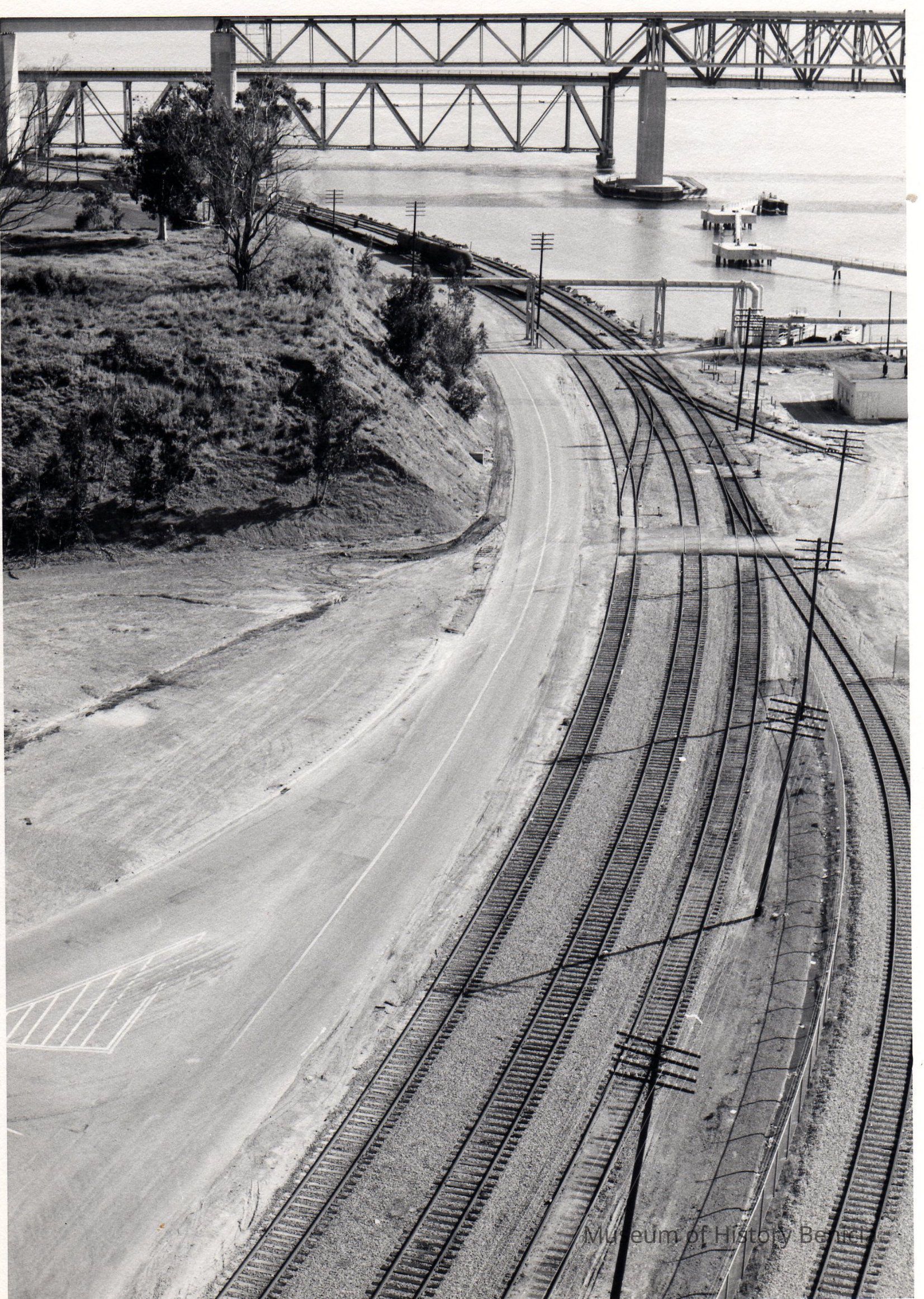 B/W photograph: set of six photos showing areas of possible construction and construction activities at the Industrial Park. This photograph looking north shows the area of railroad lines running along the shoreline, Benicia auto and railroad bridges in the background.Collection