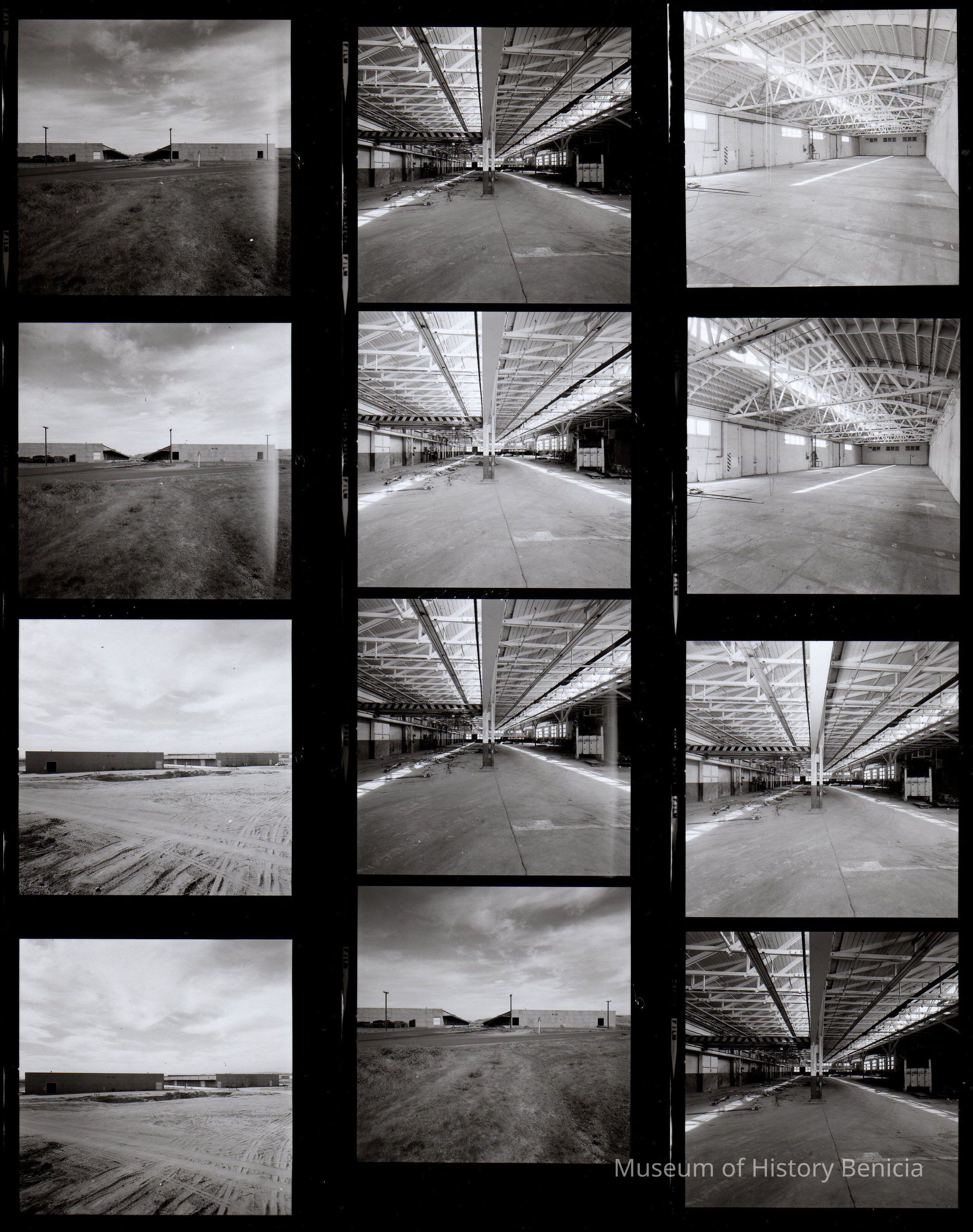 B/W contact prints: one of a set of seven showing Benicia Arsenal buildings (interiors and exteriors) when Benicia Industries moved to Industrial Park. (12 - 2.25" x 2.25" prints on page)Collection
