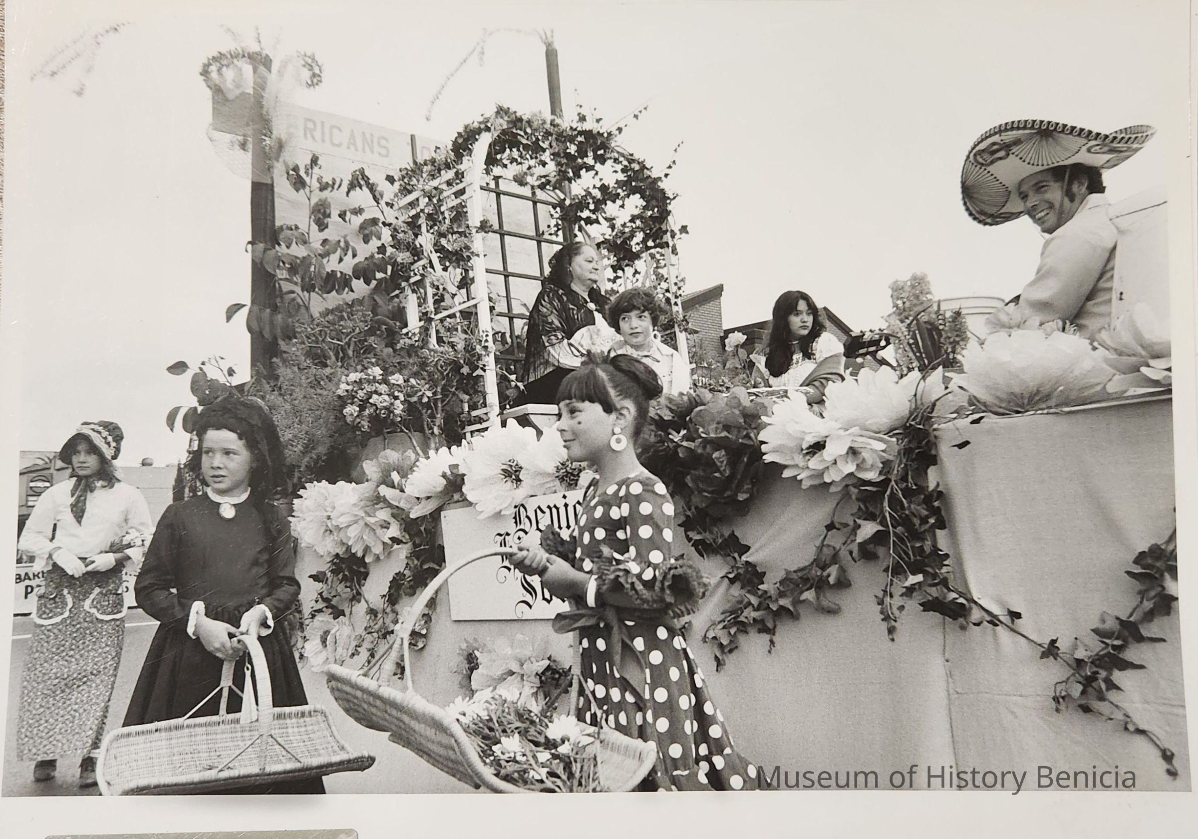 B/W Photograph from the 1979 Third of July Torch Light/First Annual Sister City Celebration Parade. The parade route was from the foot of First Street north to the City Park. This is a photograph of the "float" sponsored by the Benicia Historical Society. It honors the city's heritage with a woman portraying Dona Benicia and the visitors with the Sister City Program. Other than Mrs. Santa Ann, who is portraying Dona Benicia, the individuals riding on the "float" and the young people walking next to it are unidentified.Photograph Details