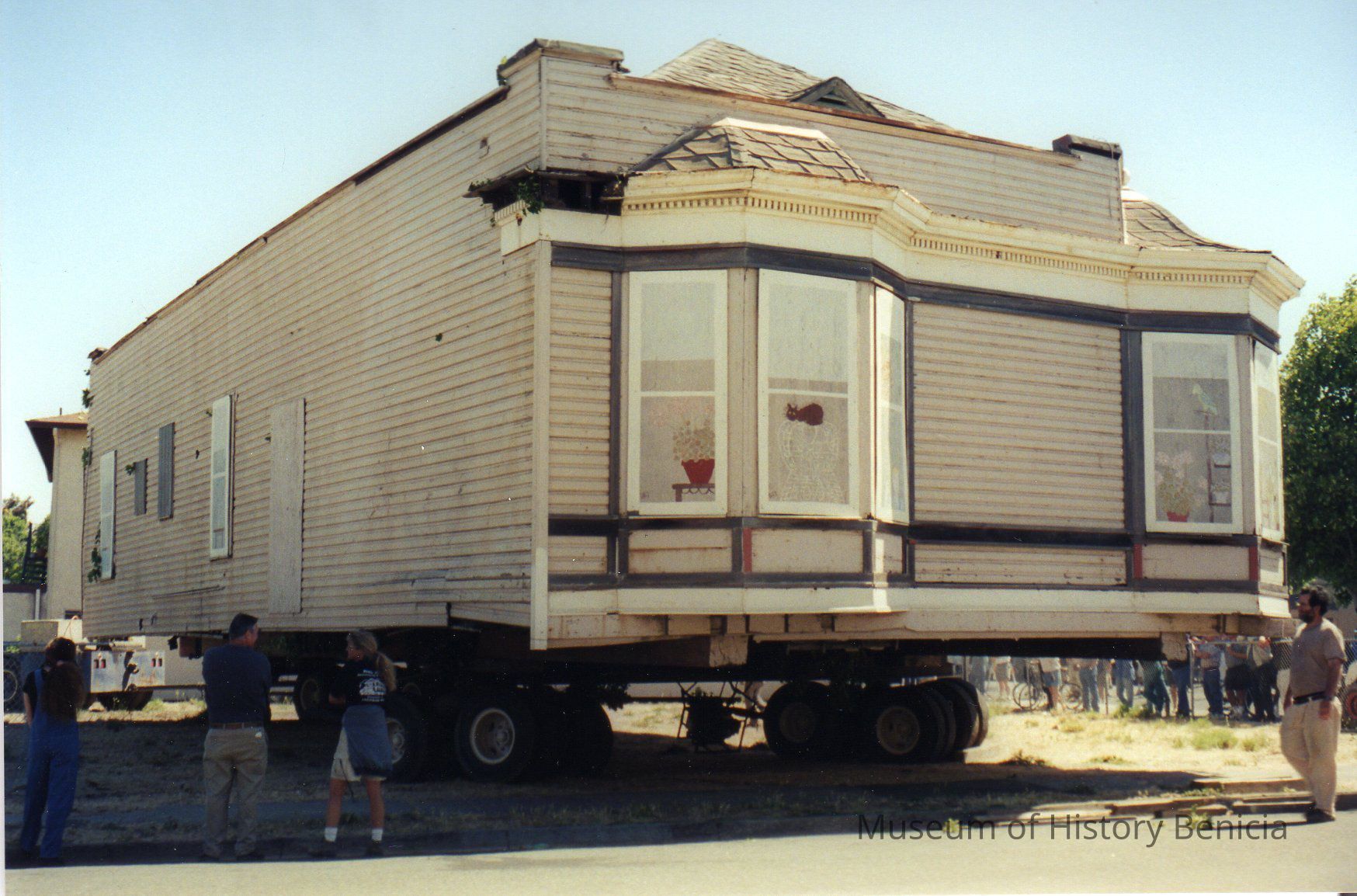 Color photo of Jurgensen's Saloon lifted off the ground approaching its new location.