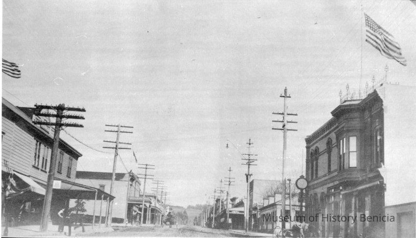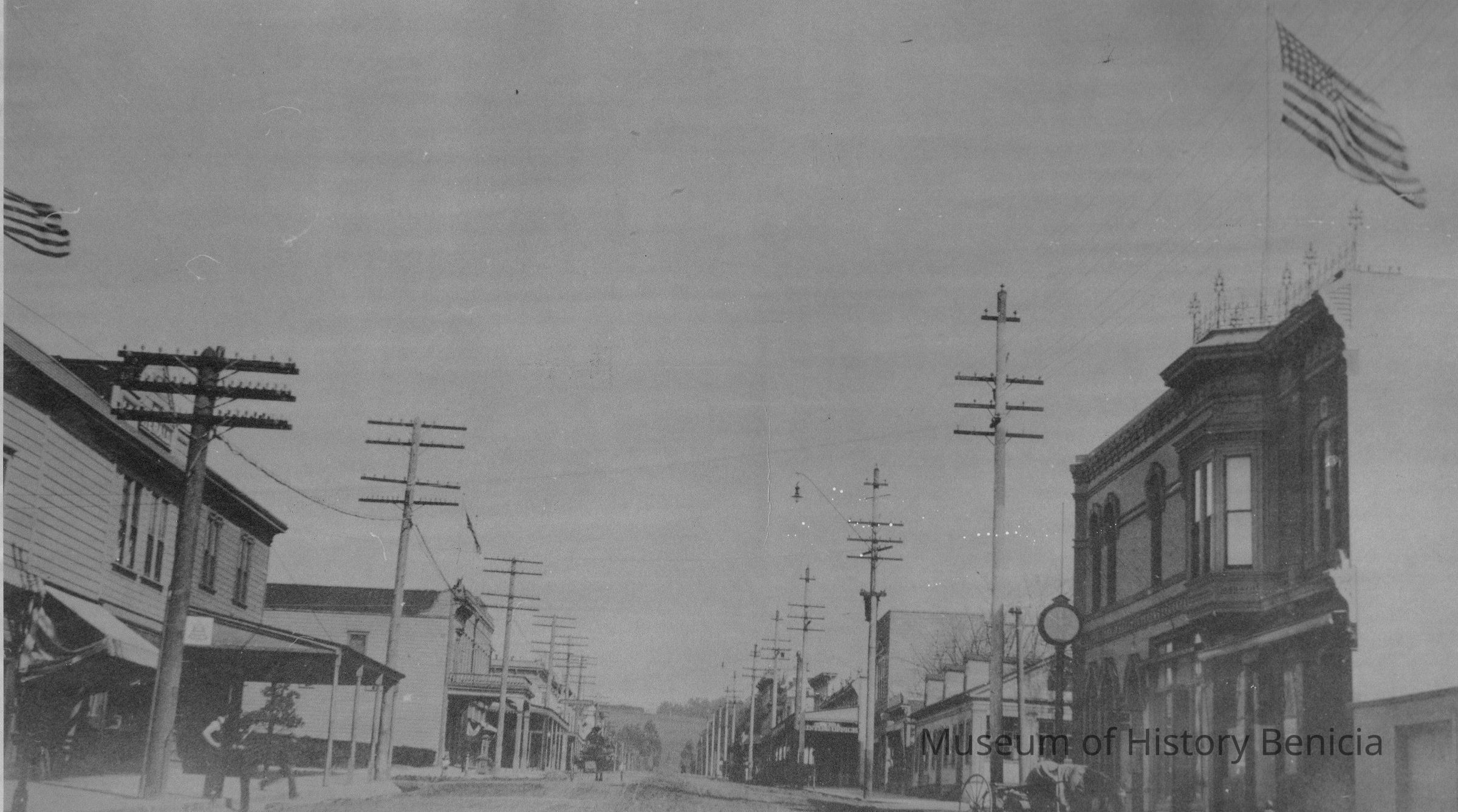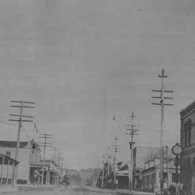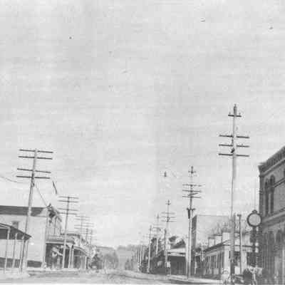 B/W photo of First Street, looking north from the middle of the street a bit north of F Street. Gothic lettering on back reads: "Restoration by F. M. Jalm" (no Subject or date is given)