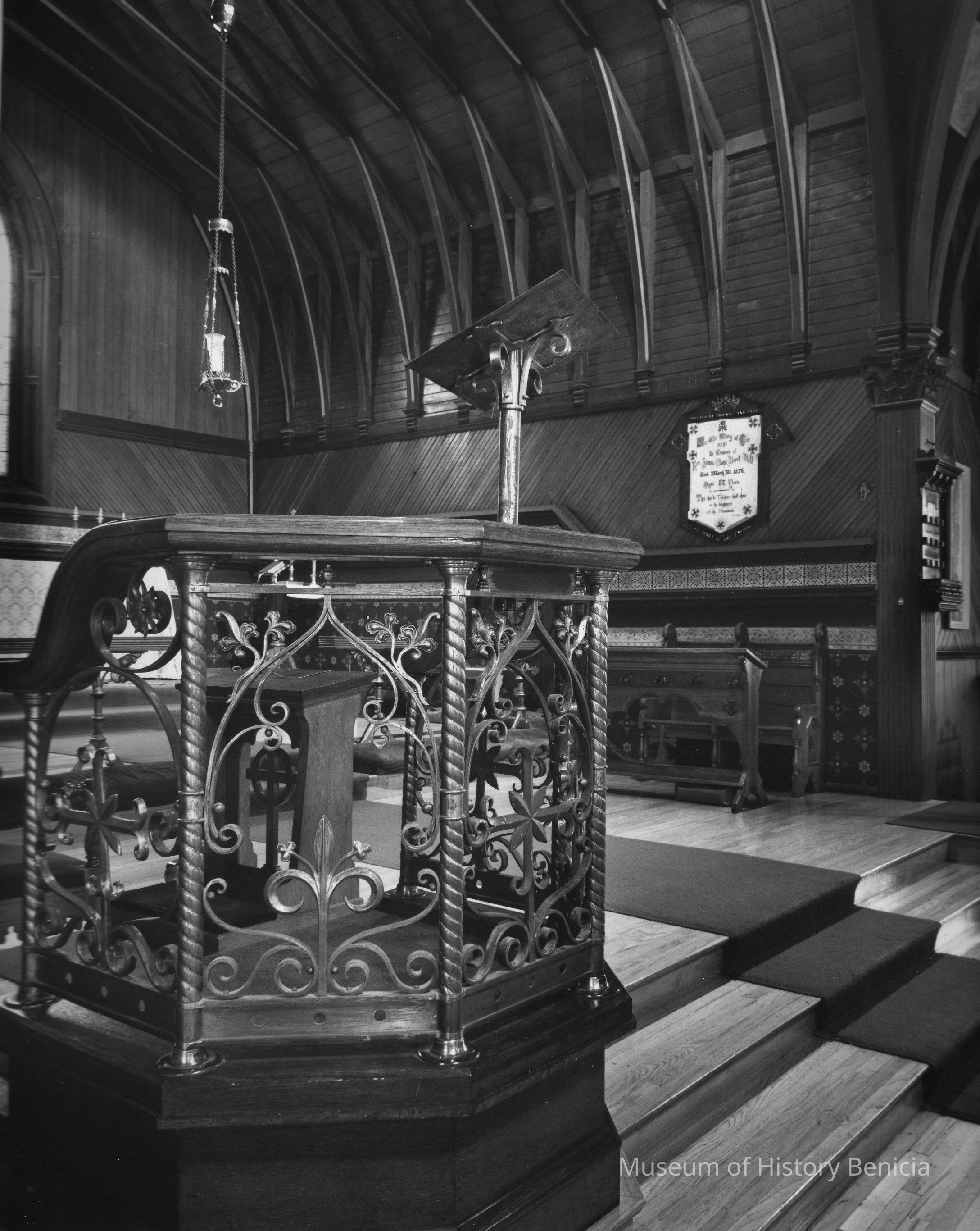 B/W photo of interior of St. Paul's Episcopal Church, showing the pulpit. Photo appears on page 40 of Bruegmann's book, Benicia: Portrait of an Early California Town.Collection
