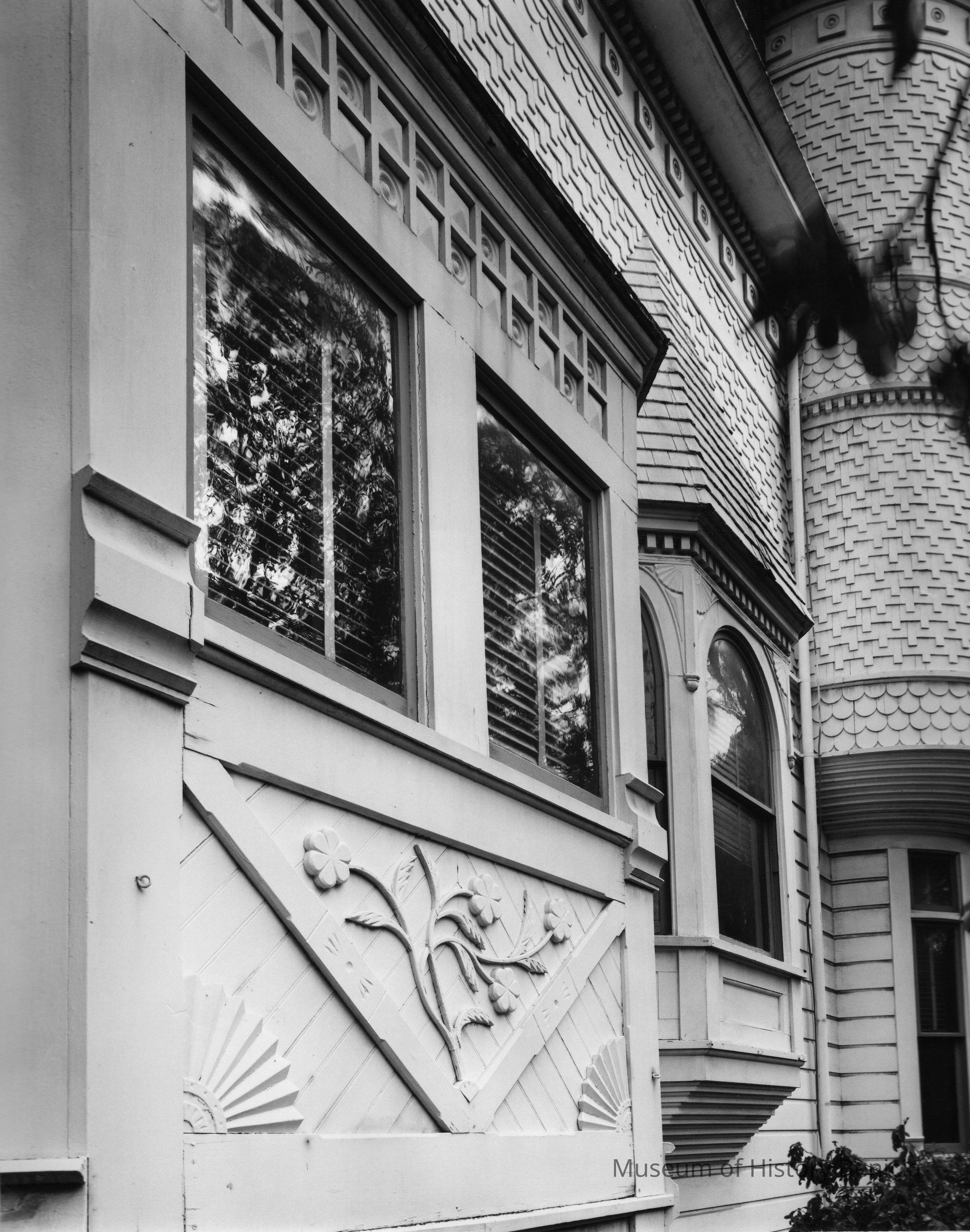 B/W photo of architectural details on west side of Riddell-Fish House. Photo is Figure 58 in Bruegmann book.