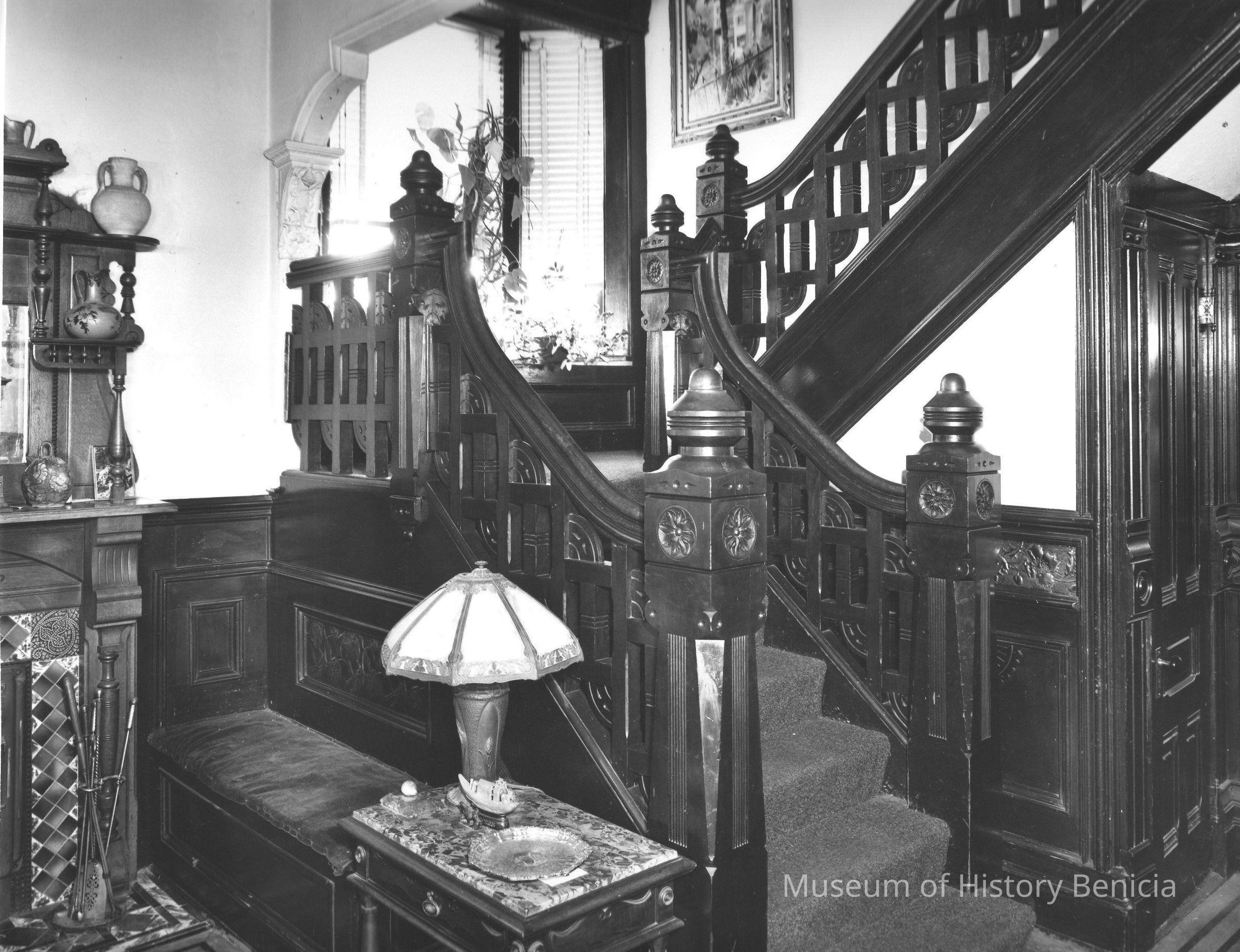 B/W photo of staircase inside Riddell-Fish House. Photo is on page 50 of Bruegmann's book.