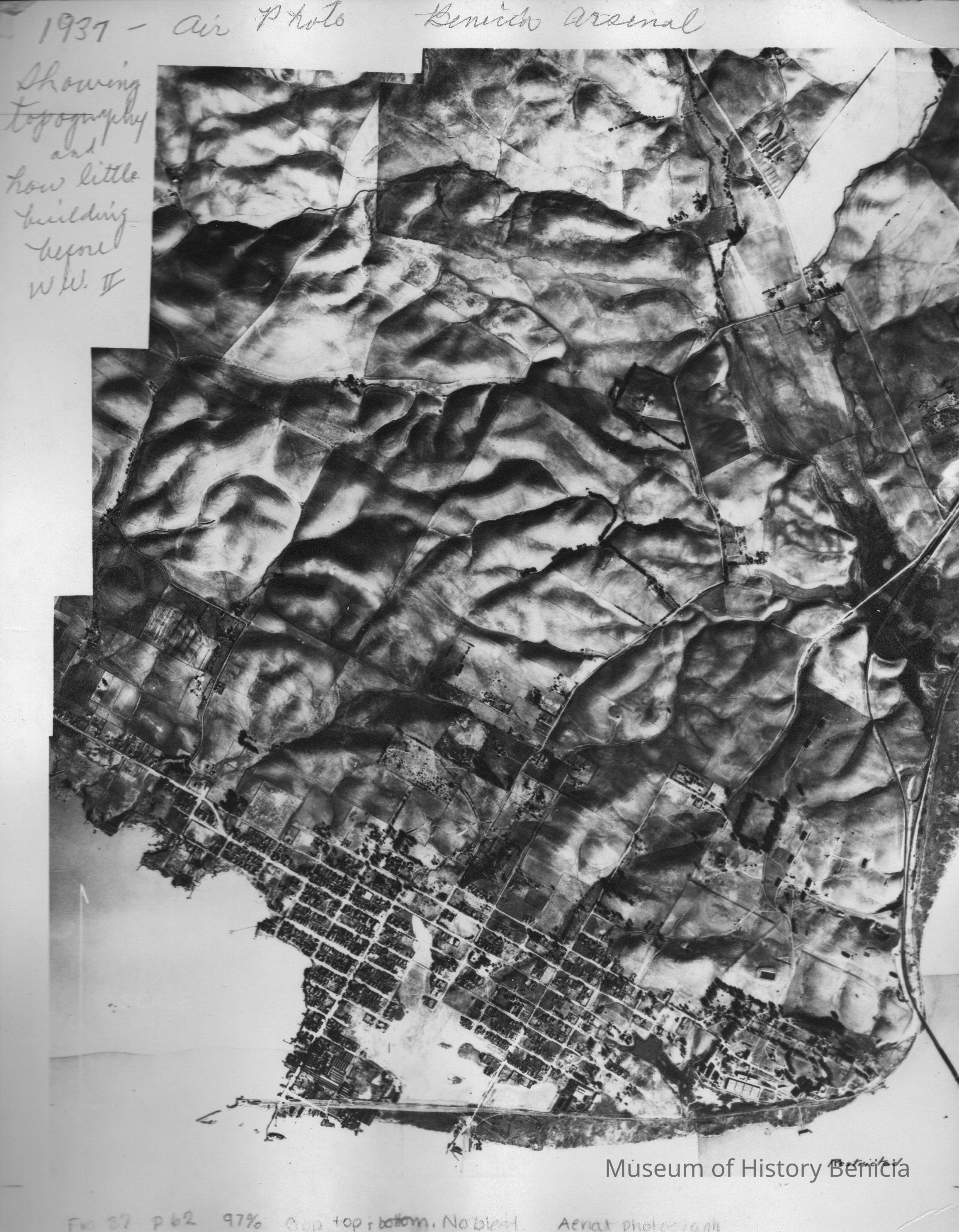 B/W aerial photo of Benicia. On front of photo has been (hand)written: "1937-- Air Photo, Benicia Arsenal, showing topography and how little building before WWII." Photo is Figure 87 in Bruegmann book.