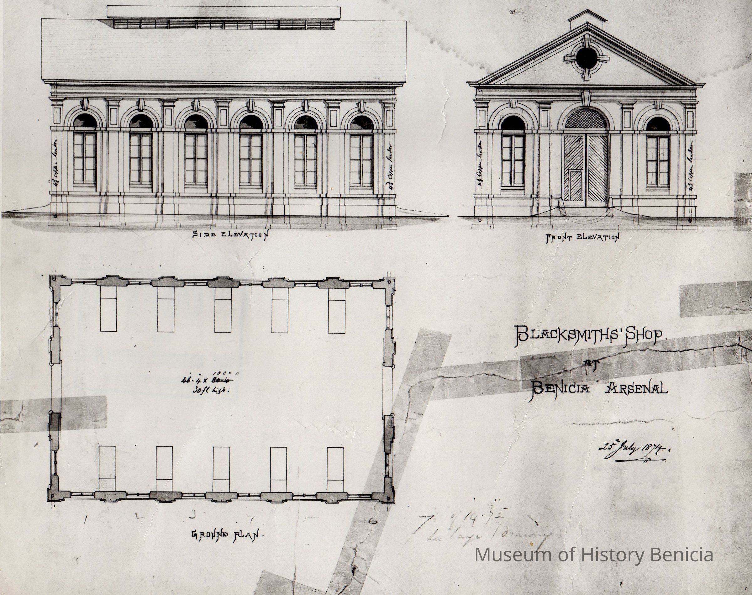 B/W copy from the National Archives of Plan and elevations of Blacksmith Shop at Benicia Arsenal. Photo is Figure 137 in Bruegmann book.Collection