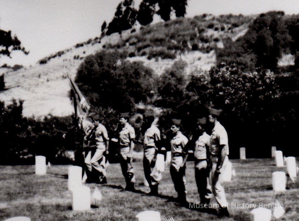 B/W photo of nine men in uniform at Military Cemetery for Memorial Day ceremonies. Label on back identifies men as (L-R) "SSG Zarling, SSG Lambert, SSG Fauver, SP4 Hawkins, SP4 Doty, SP5 Bradford, SGT Williams, SSG Balecha and SSG Perry." Last three men to the left hard to distinguish.Collection