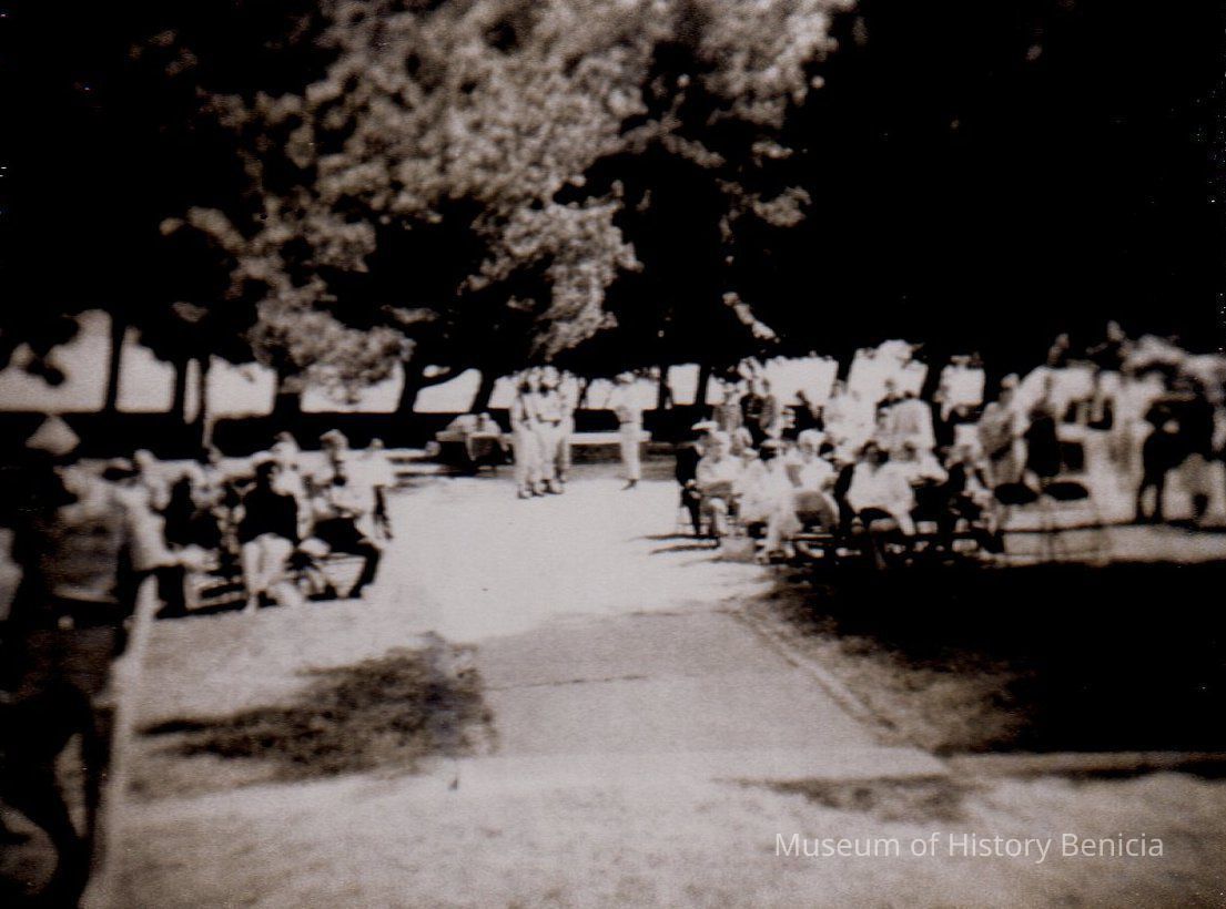 B/W photo of people, some sitting, some standing, in Military Cemetery. "May 1980 Benicia Memorial Day" written on back in ink.