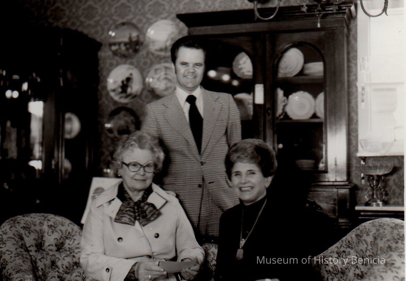B/W photo of (L-R) Gladys Wold, Warren O'Blennis, and Zelinda Lopes in Benicia Antiques.