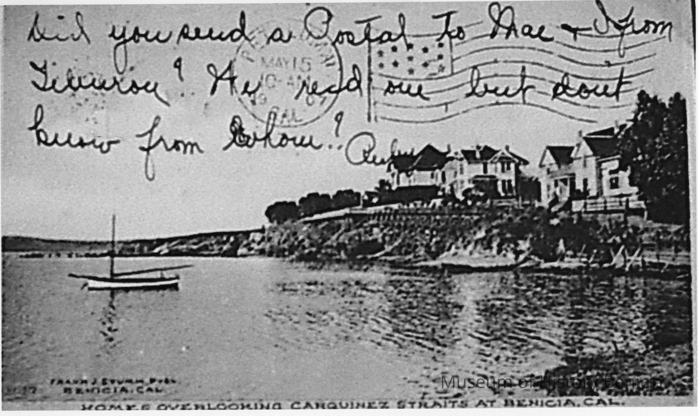 B/W copy of Stumm postcard showing "Homes Overlooking Carquinez Straits at Benicia Cal". Postcard bears Petaluma postmark May 1907 and handwriting on upper front reading "Did you send a Postal to Mae & I from Tiburon? We rec'd one, but don't know from whom" and unreadable signature (might be "Ruby").