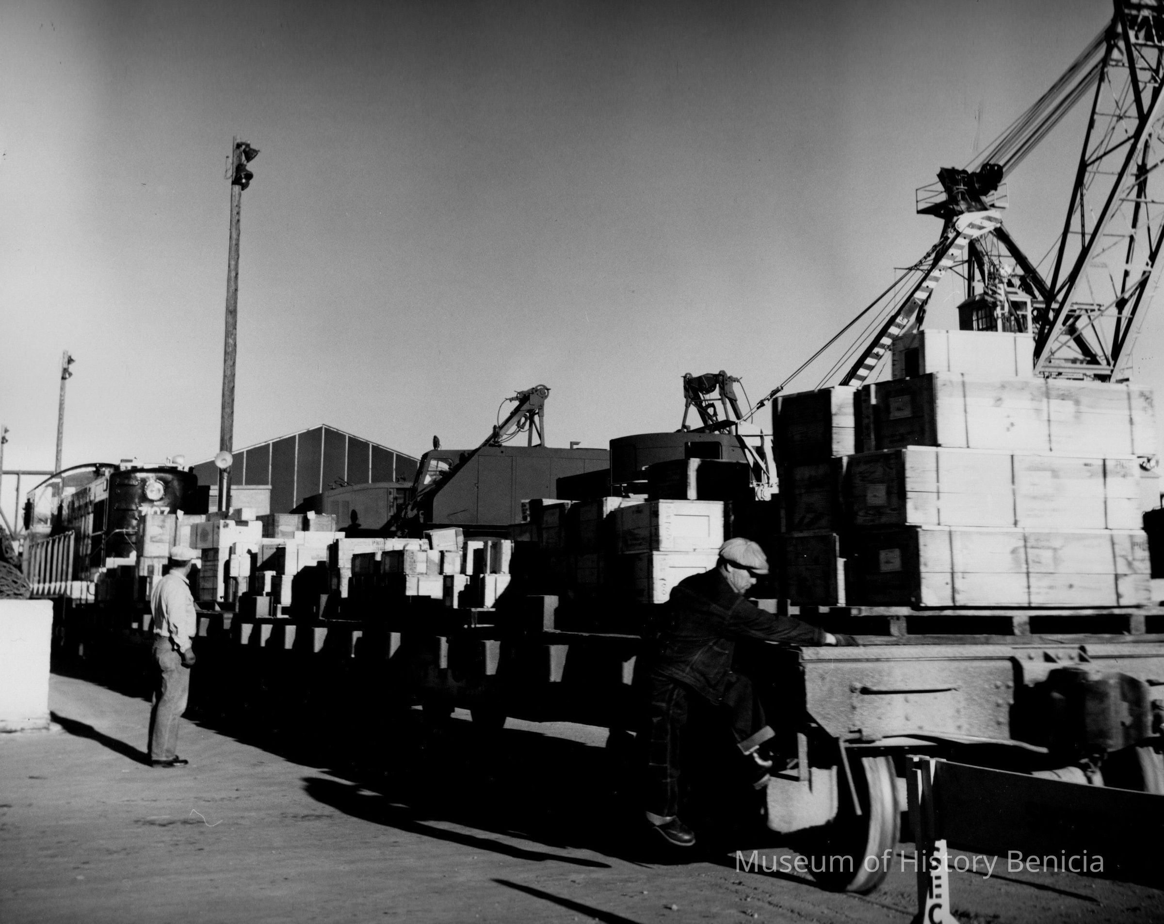B/W photo showing train flatcars loaded with crates. Typed on back: "Benicia Arsenal's small inter-depot railroad is loaded in the storage area for hauling of material to the docks for shipping."Collection