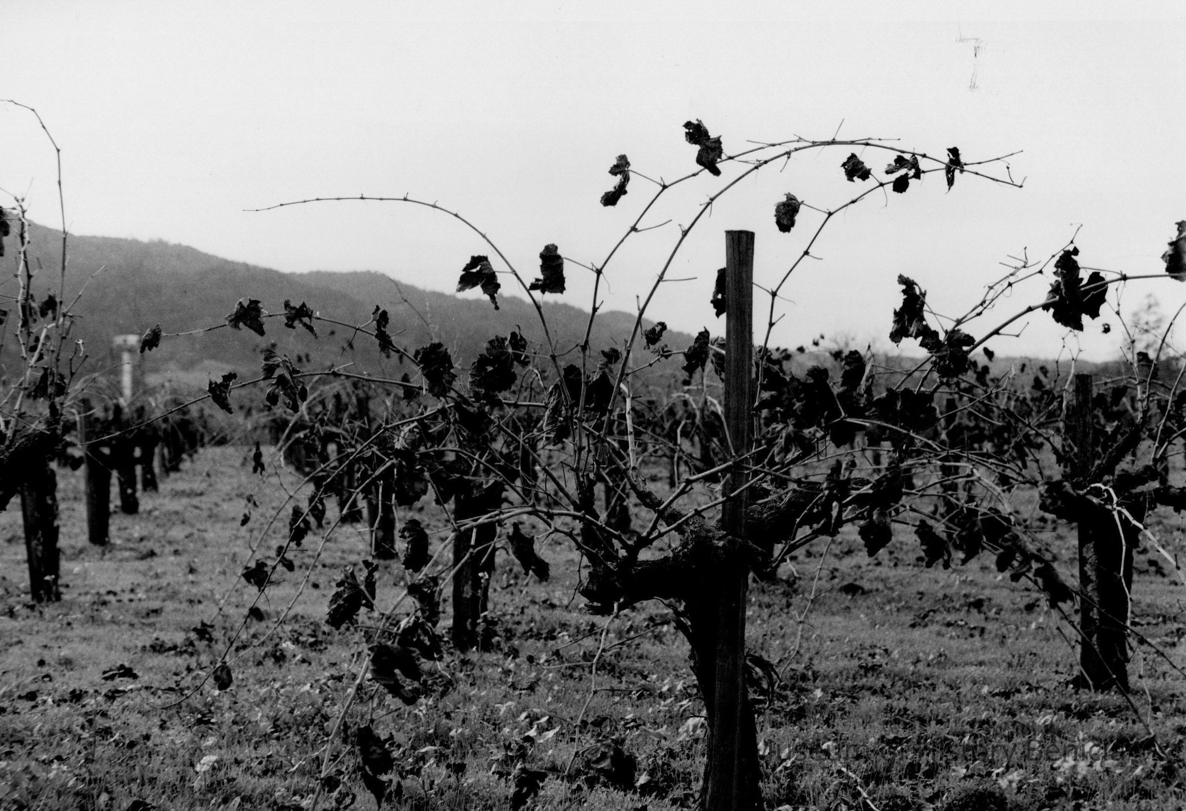 B/W photo of a vineyard; Forested hills in the background suggest that this could have been taken in the Napa or Sonoma Valley. Leaves appear to be dying and no grapes are on the vines.Collection