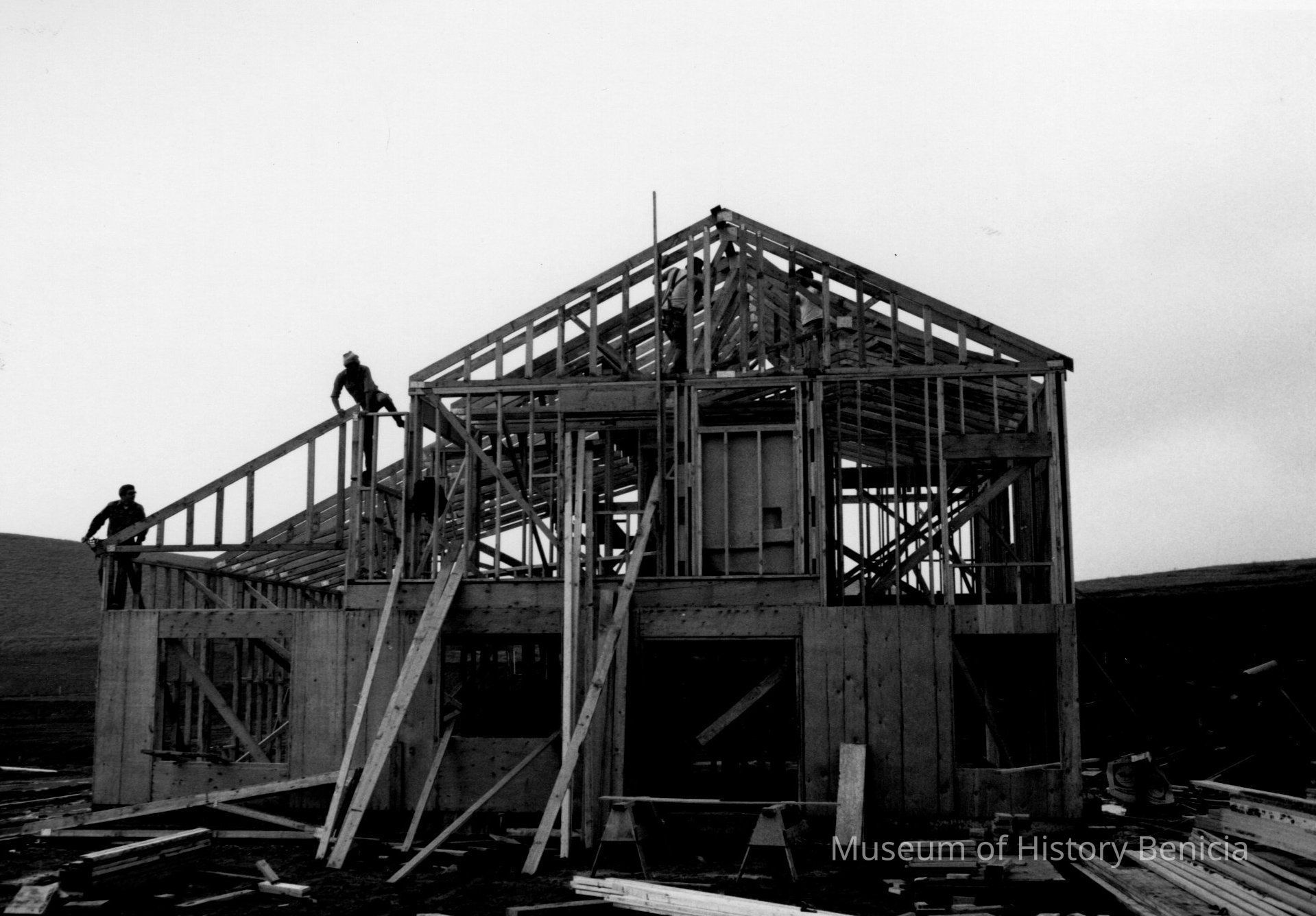 B/W photo of two-story house under construction; empty hills in background. "12/5/85" written in blue ink on back of photo.