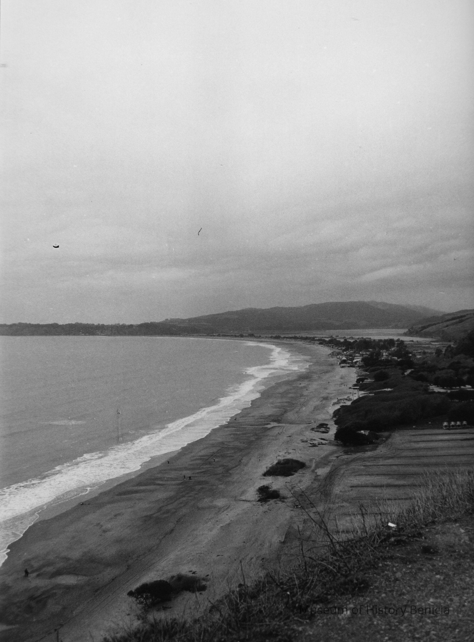B/W photograph of wide beach - possibly this is Stinson or Muir Beach in Marin County with Bolinas at left and Bolinas Lagoon right of center.Collection