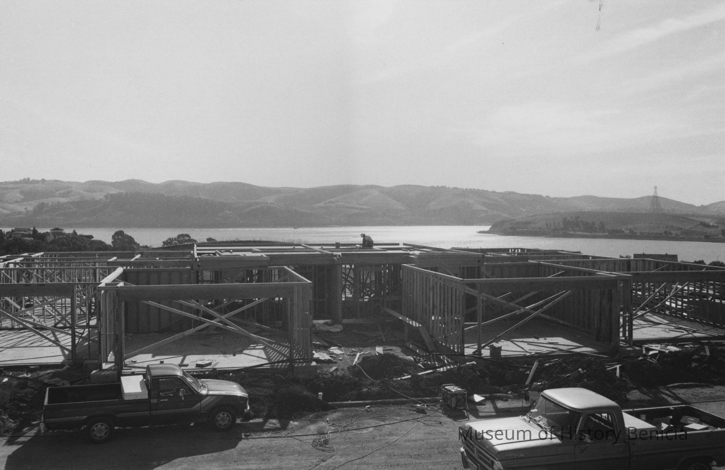 B/W photograph of construction on London Circle. Two trucks in foreground, Carquinez Strait in background. Same as 2002.013.0045.Collection