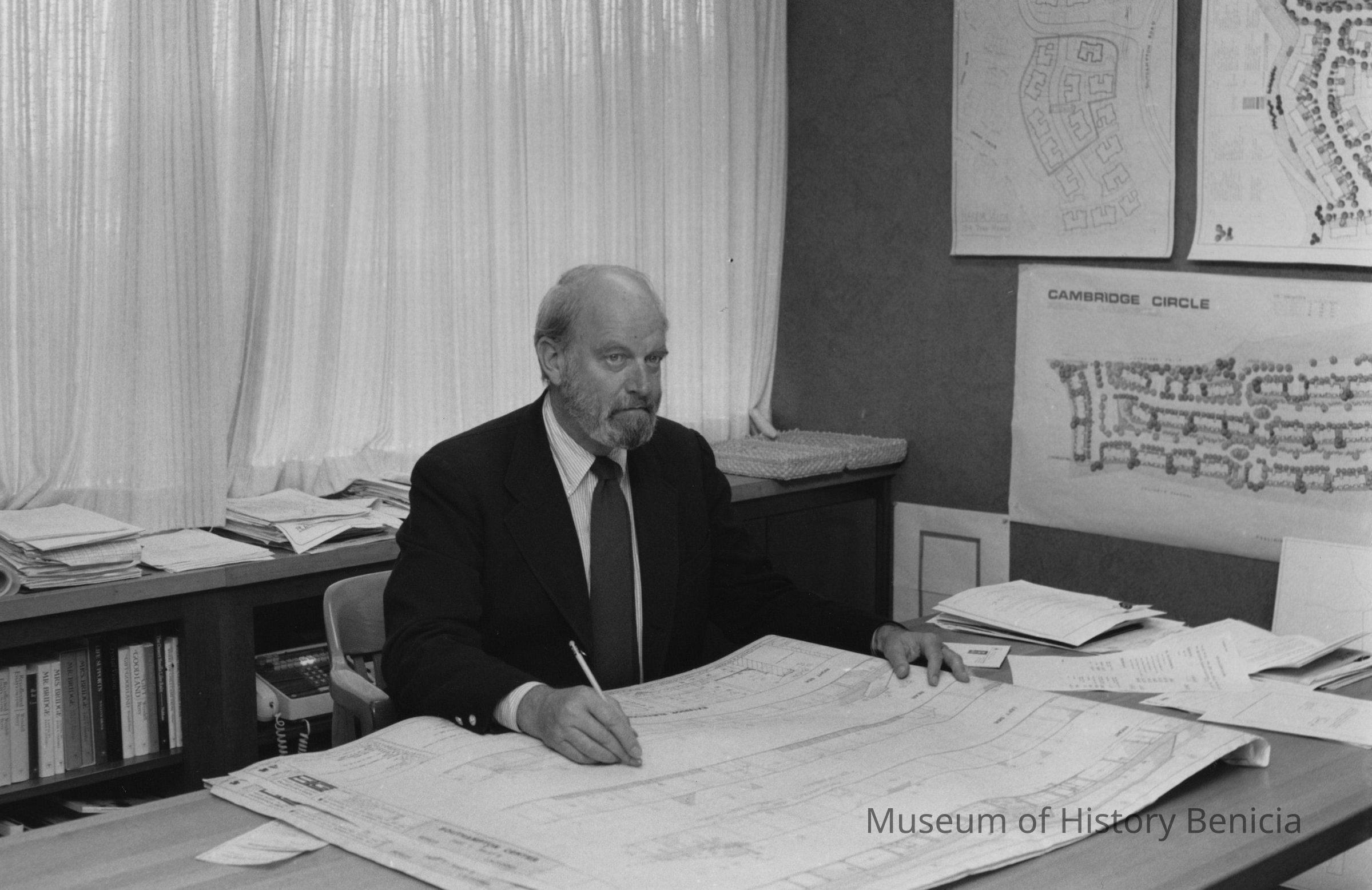 B/W photograph of William Turnbull sitting at desk w/blueprints, pencil in hand. Plans for Cambridge Circle development are on wall at the right side of photo.Collection