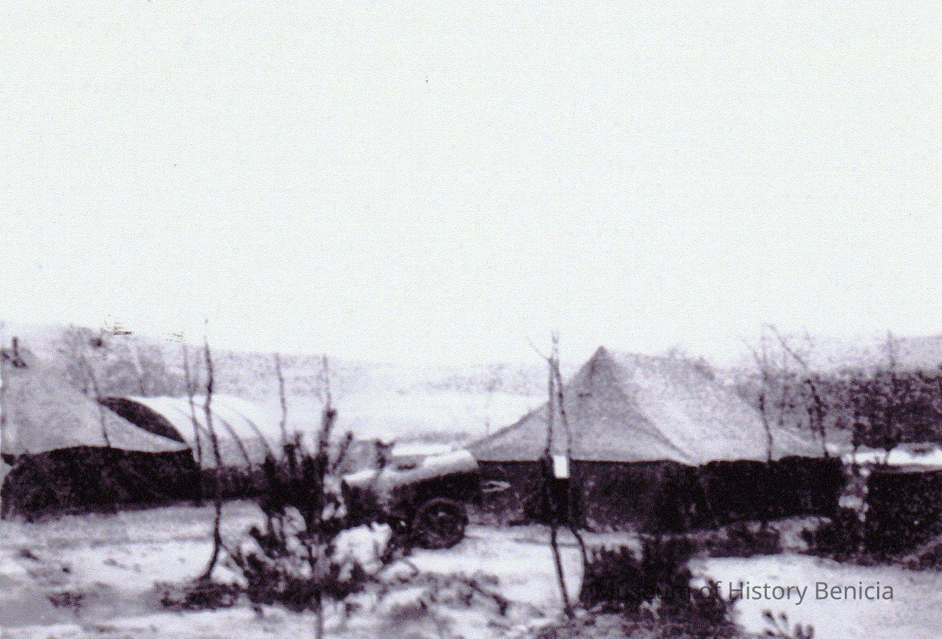 B/W photograph, unlabeled; based on others from the same source, it is probably a picture of army tents in Korea, there is some sort of storage tank on wheels in the lower center.Collection