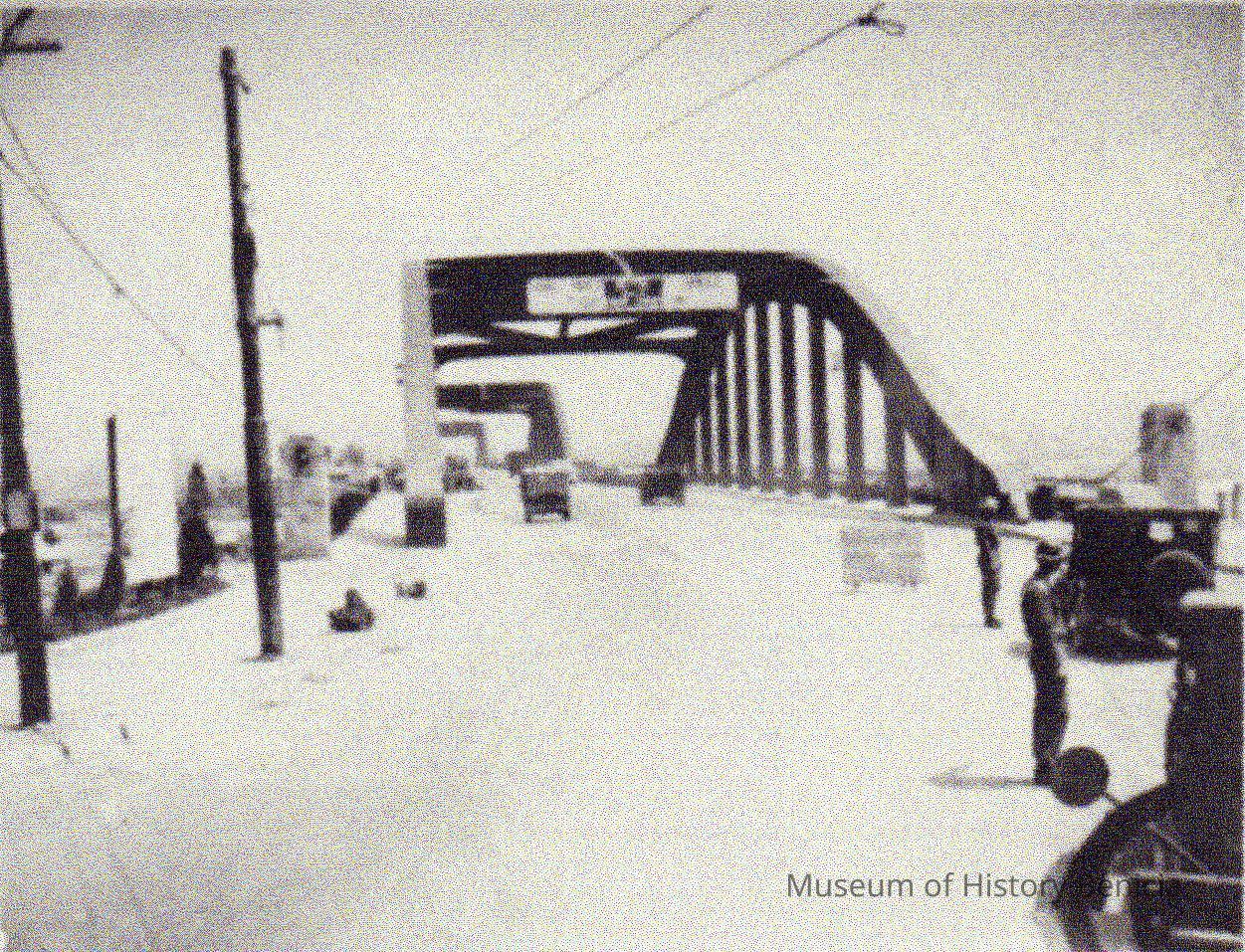 B/W photograph - written on the lower edge of the photo in blue ink: "Hon River Bridge 1952". Armed guards can be seen at the right along with vehicles traveling to and over the bridge.Collection