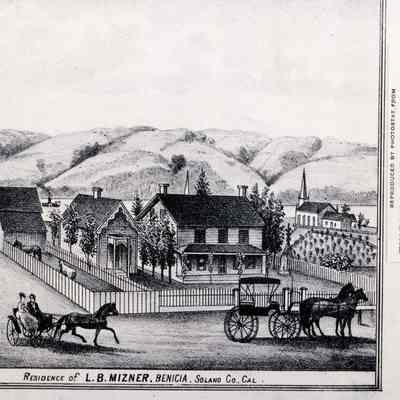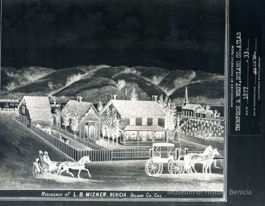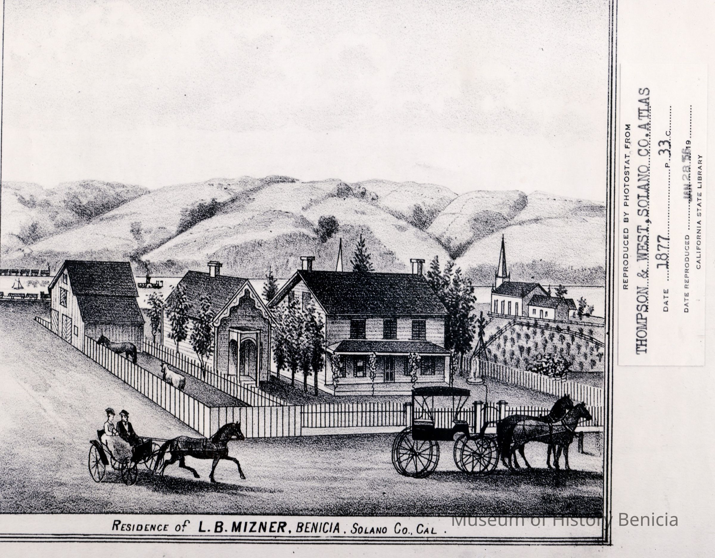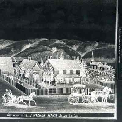 Reproduced photograph (looks like a negative) of the sketch of the Mizner Residence in Benicia. See 2004.011.002 for more information on this sketch. The sketch of the Mizner residence is below two cut off images labeled "bridgport, Solano Co. Cal." and "Pioneer Brewery, Edward McGettigan, Propr, Vallejo, Cal." To the side of the reproduced image the text is as follows: "Reproduced by Photostat from Thompson & West, Solano Co. Atlas. Date 1877, P. 33. Date reproduced Jan 28 '56. California State Library"Collection