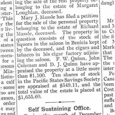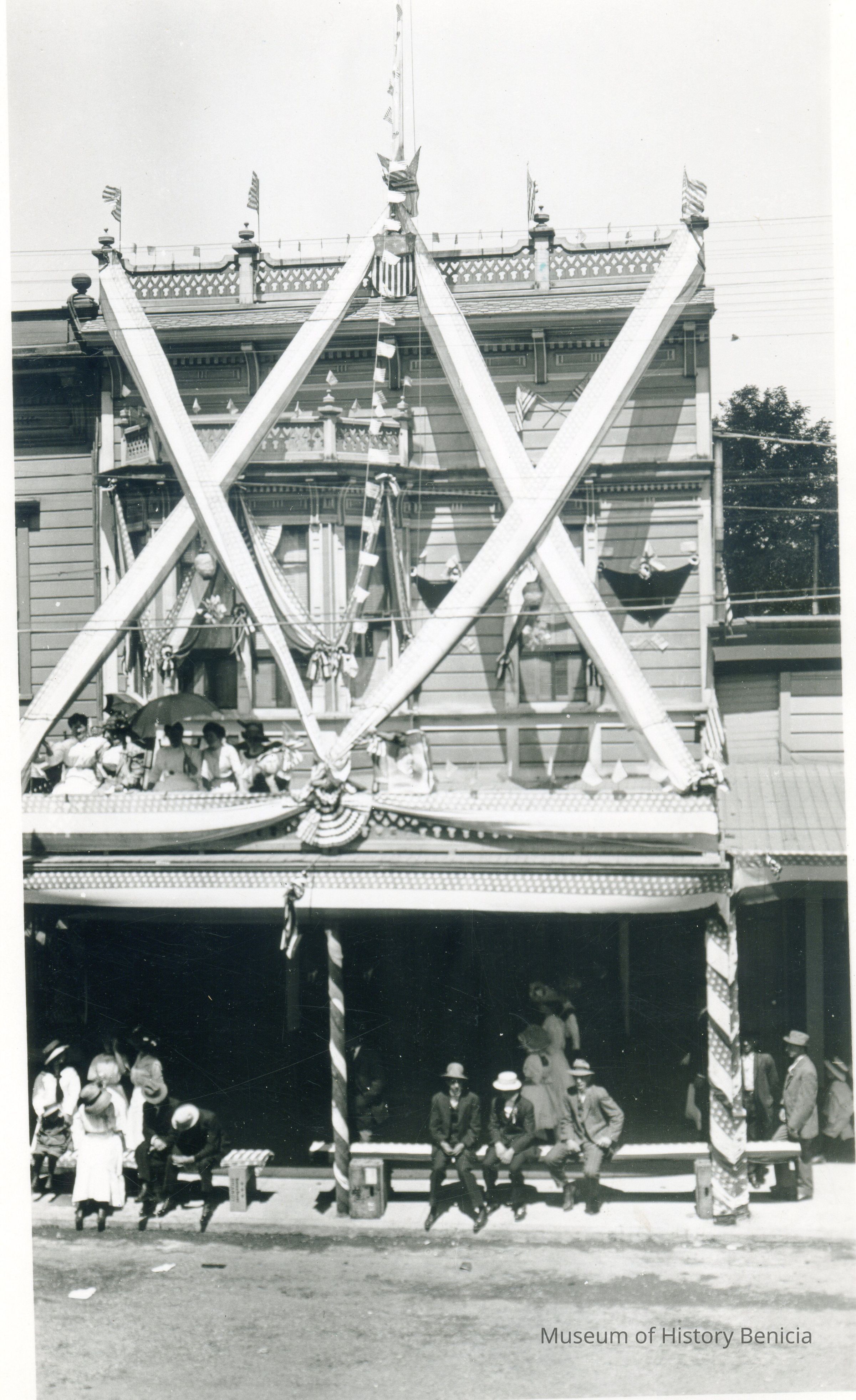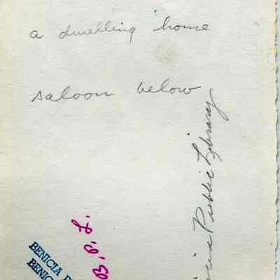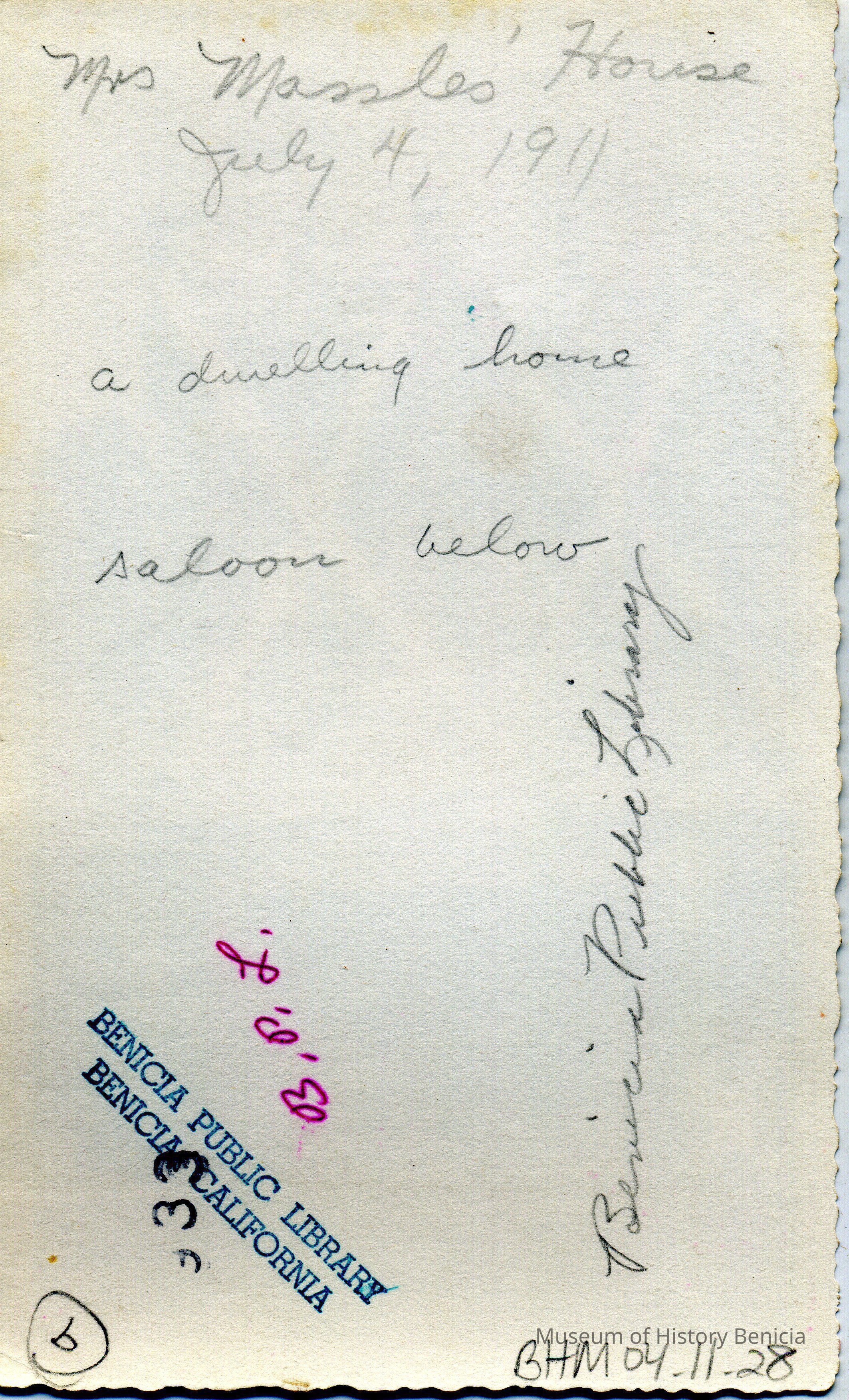 B/W photograph - written on the back in pencil: "Mrs. Massles' House, July 4, 1911, a dwelling house saloon below". In the 1920 and 1930 census this house is shown as being at 815 First St. Benicia. In a newspaper item from 05/1904 the saloon is mentioned that was owned by Richard Massle and that next door was his cigar factory which made "Gem" cigars.Collection