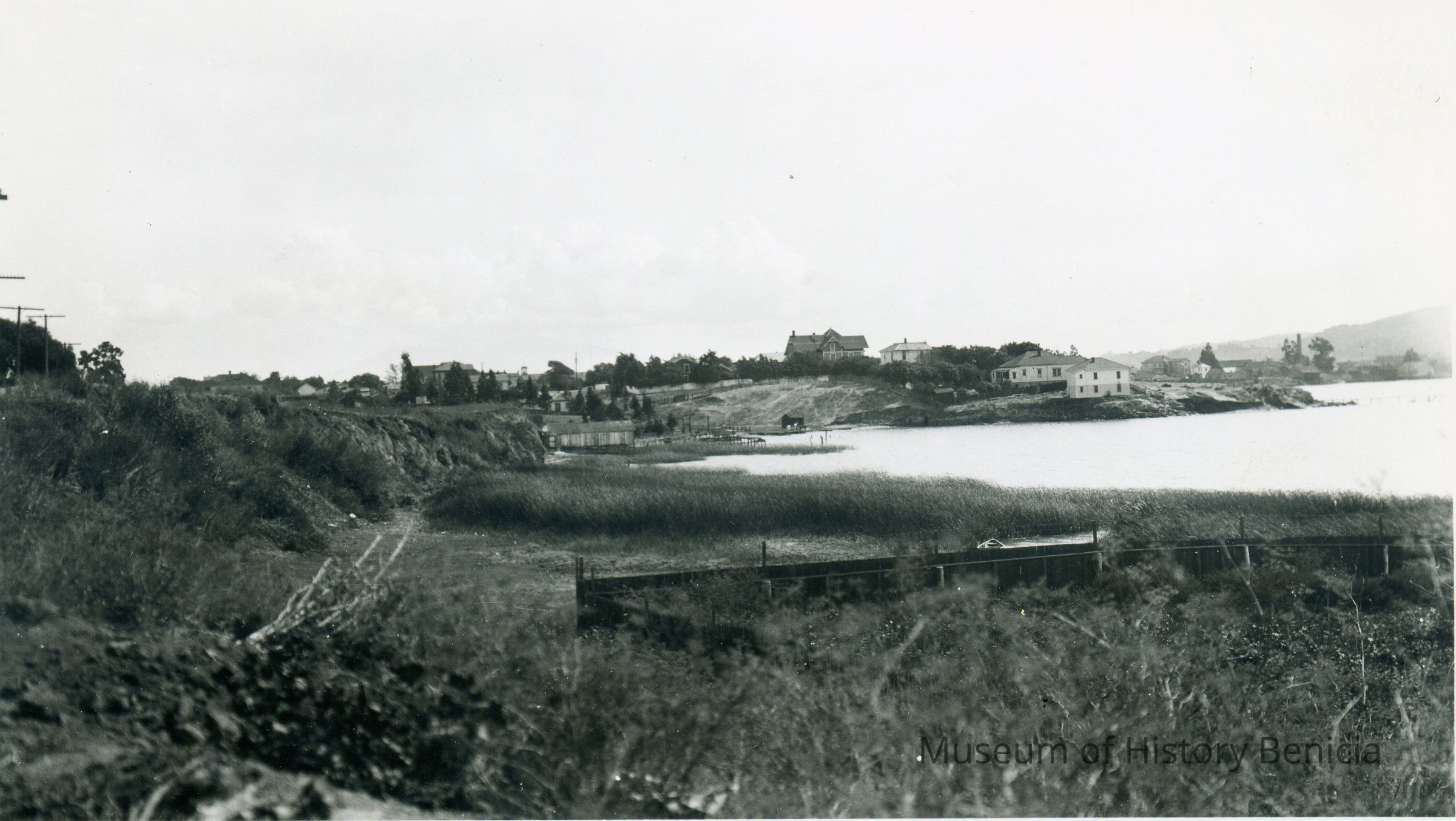 B/W photograph of Benicia's western shoreline looking east toward Benicia.