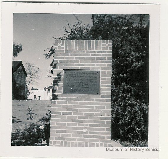 B/W photograph of a plaque on a brick monument. (the writing on the plaque is too small to read) There are buildings in the background. Reference BHM 04.11.14 - this monument was next to the State Capitol at one time.Collection