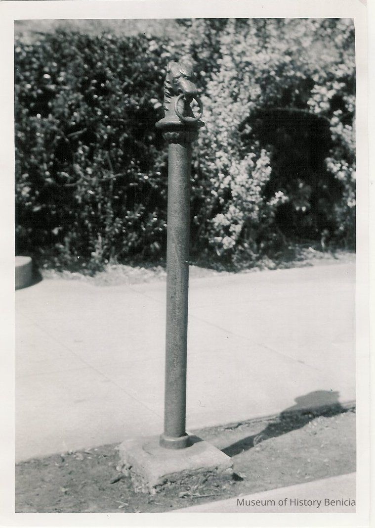B/w photograph of an old iron hitching post in front of a home (Margaret Donahoe's) on first street, across from the city park.