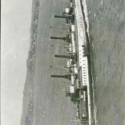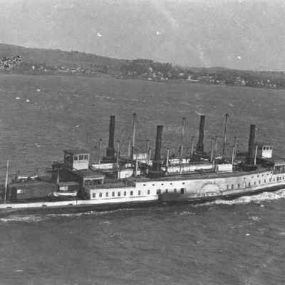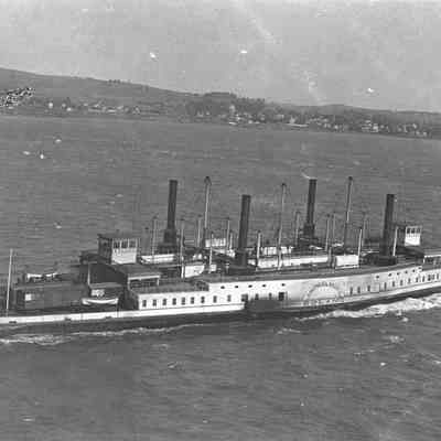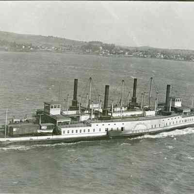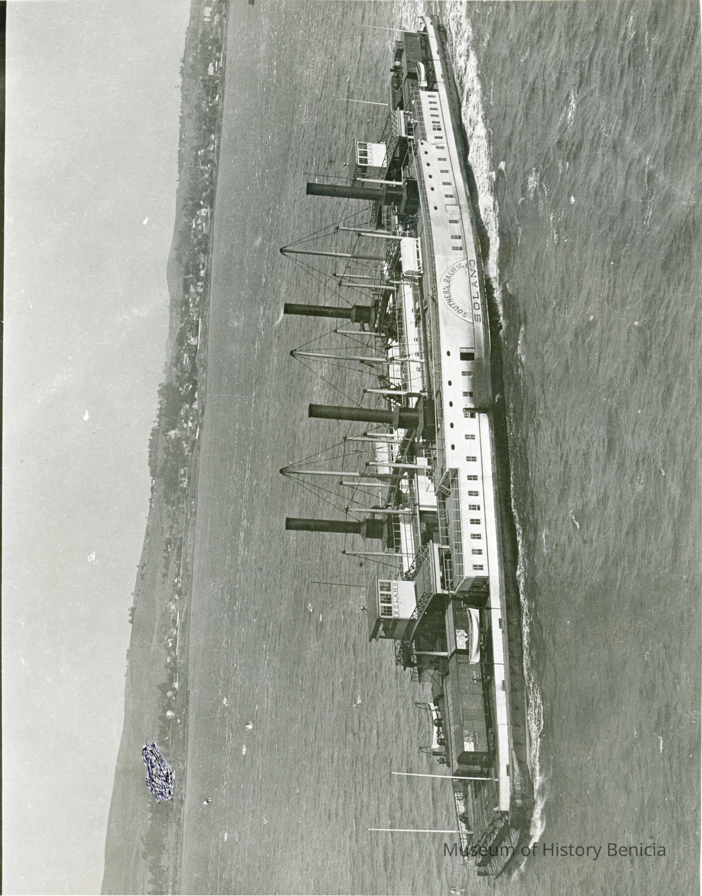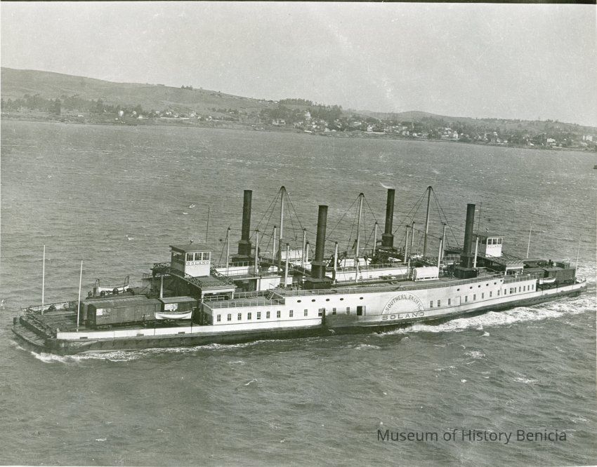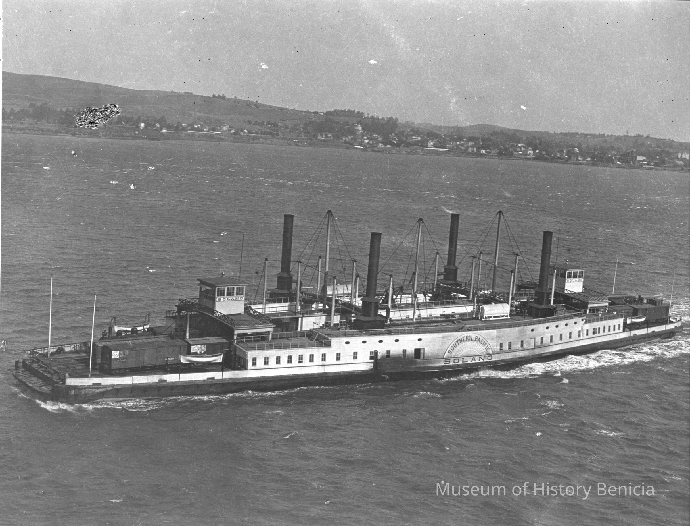 B/w photograph with a view of the Southern Pacific Solano Ferry, carrying train cars across the Carquinez straits