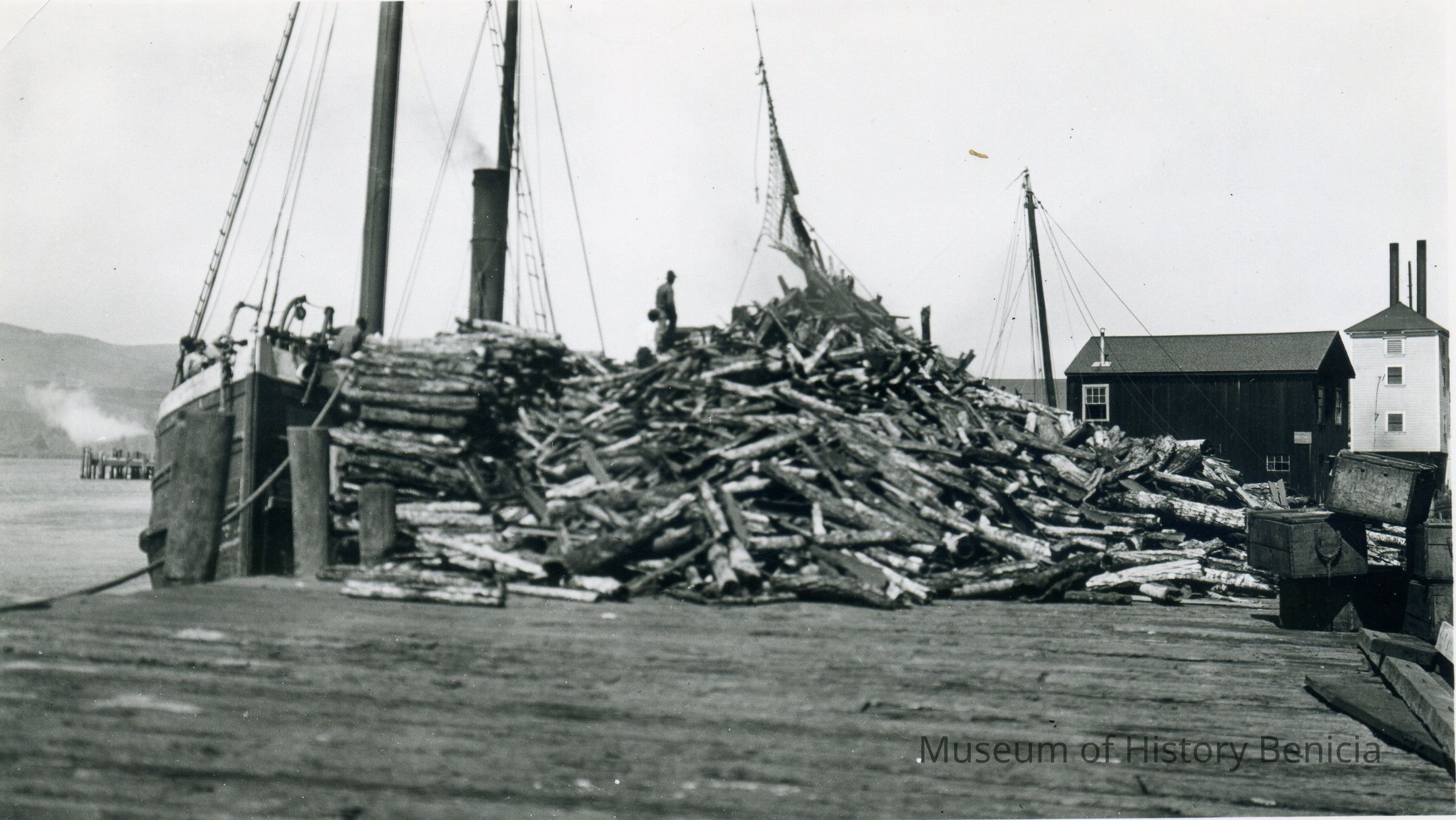 b/w photograph of a ship unloading bark at Wharf, Benicia.