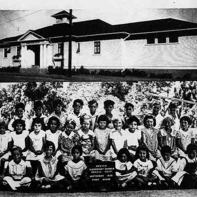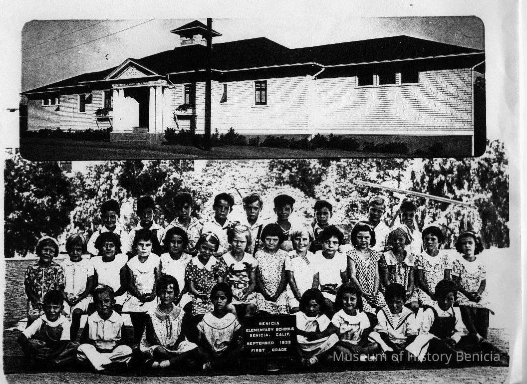 B/W photocopy of two B/W photographs. At the bottom is The Benicia Elementary School (Primary School) First Grade class in September 1935. At the top is The Primary School Building.Collection