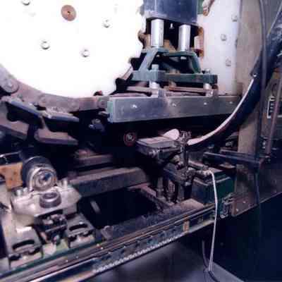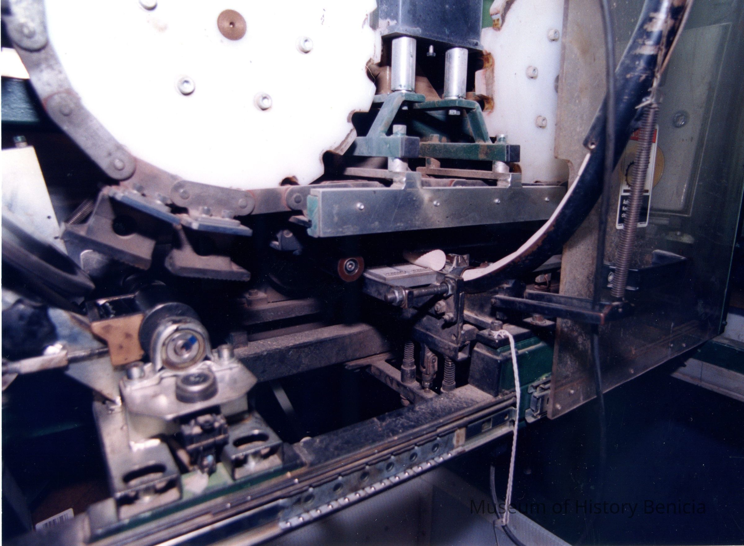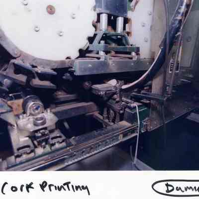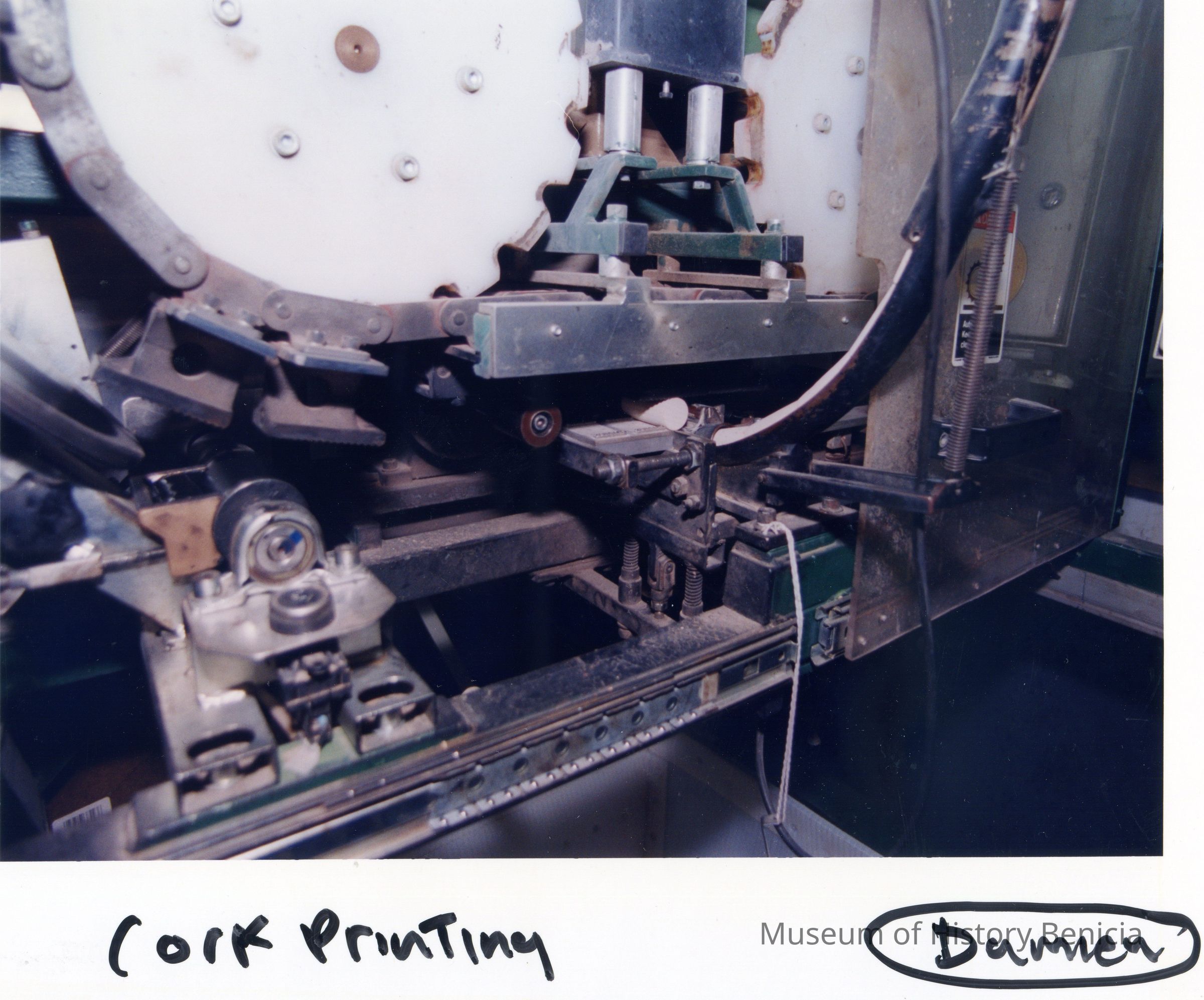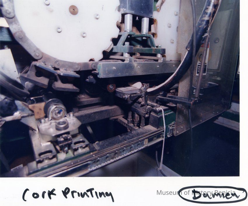 Color photograph close up to a machine. The photo is labeled "Cork Printing". This photo was taken at a business in the Benicia Industrial Park.Collection