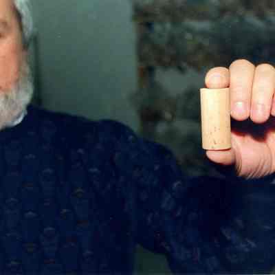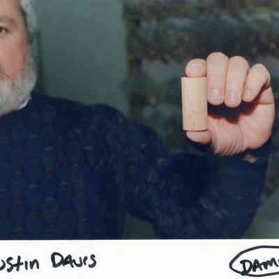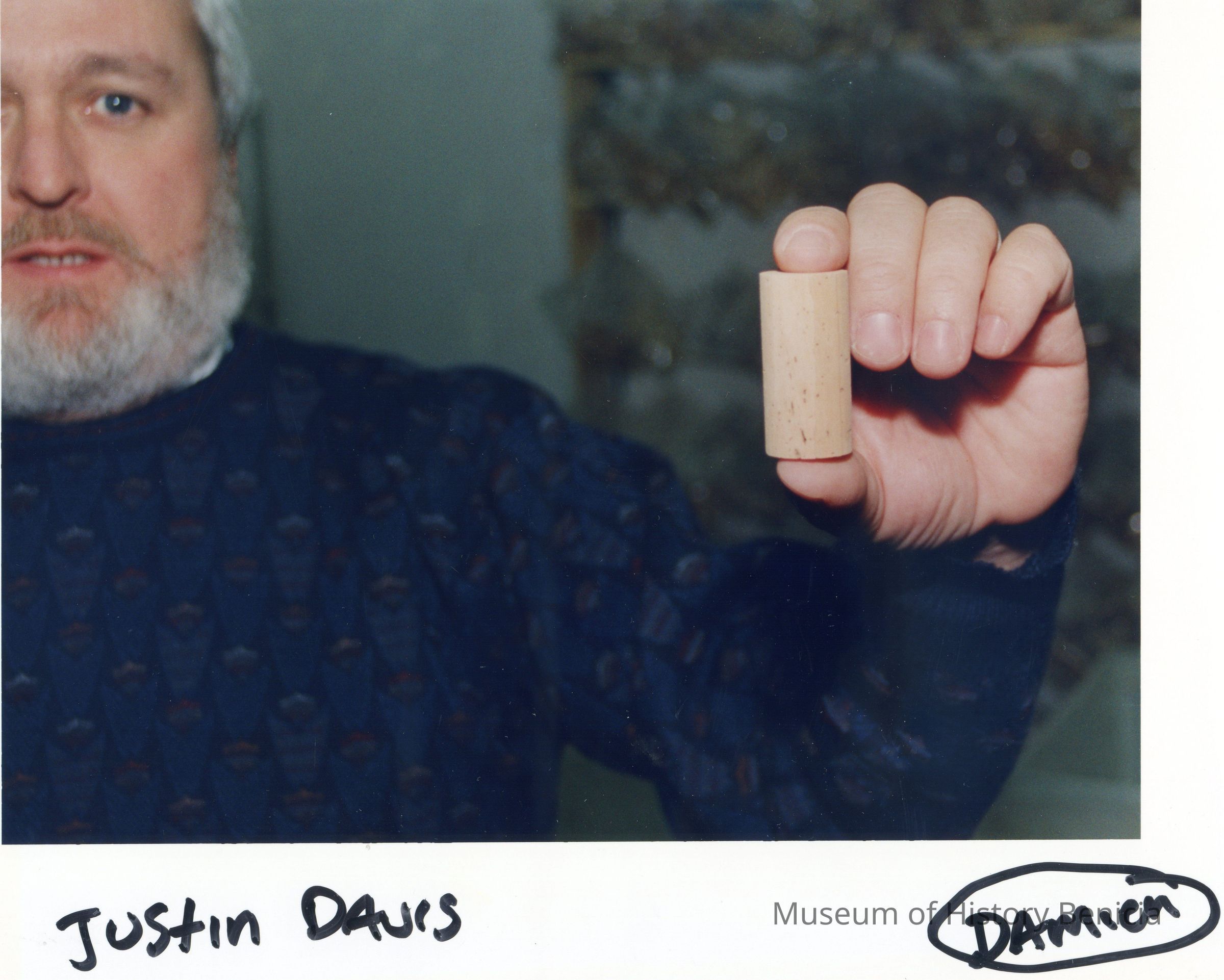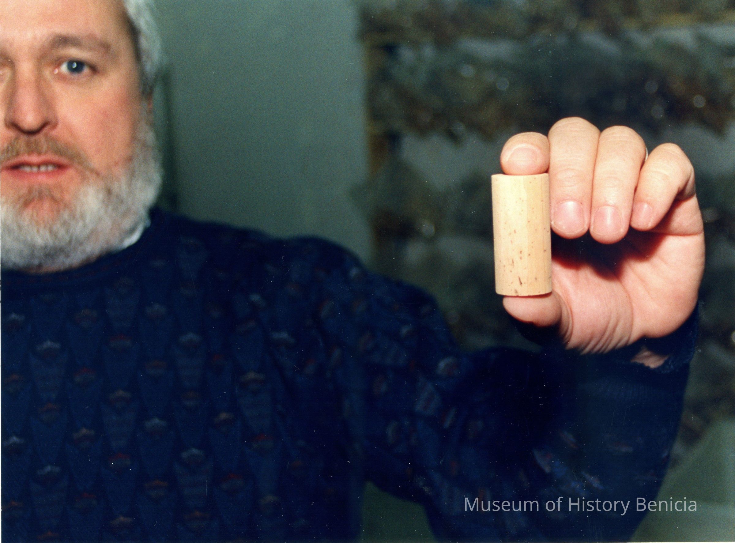 Color photograph closeup of a man, Justin Davis, holding a wine bottle cork in his left hand. The photo was taken at a business in the Benicia Industrial Park.Collection