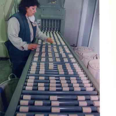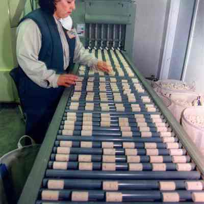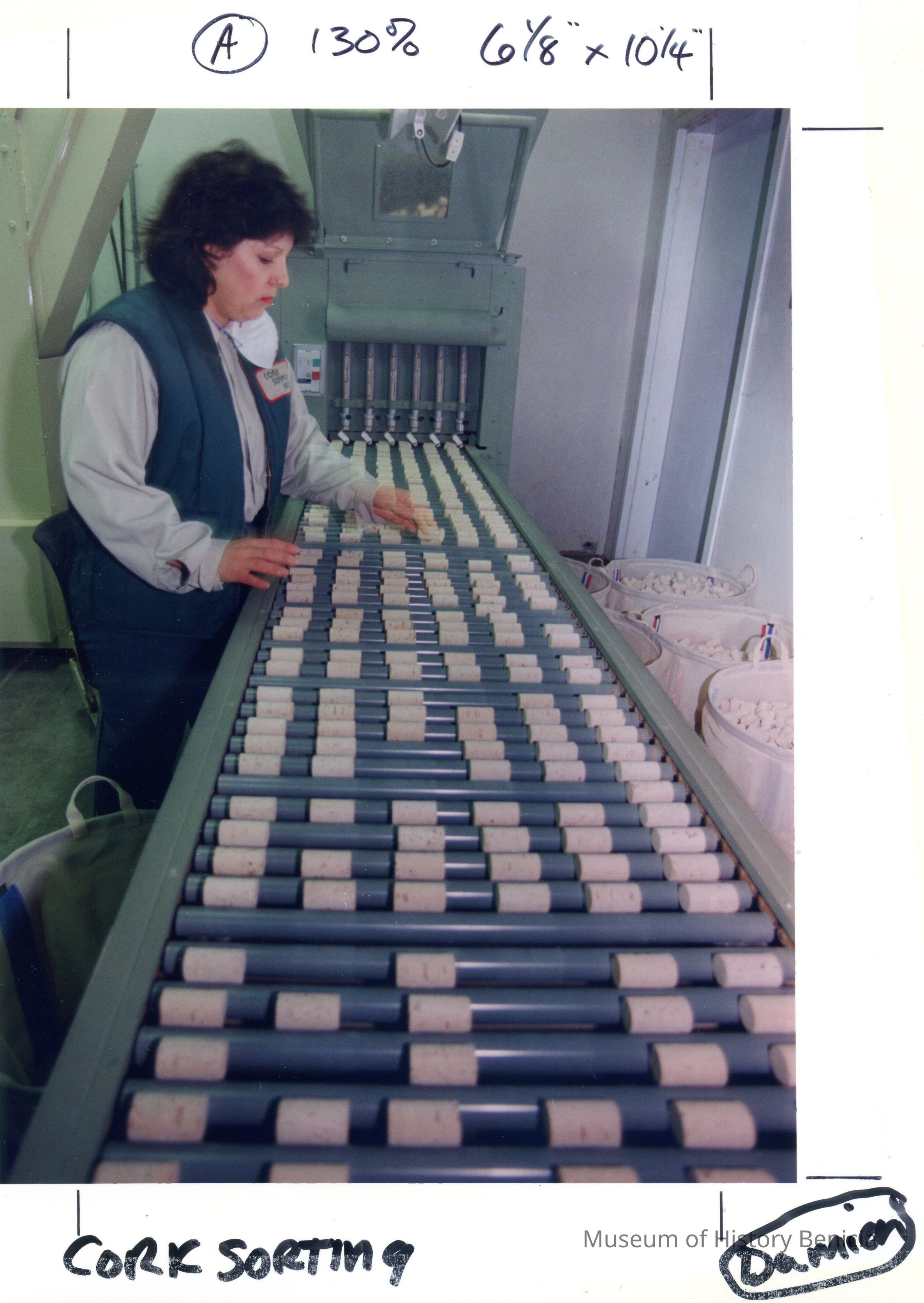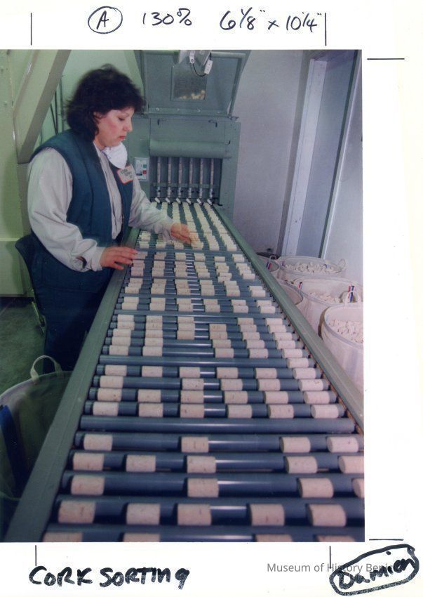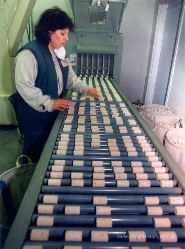 Color photograph of a woman sorting wine bottle corks at a business in the Benicia Industrial Park.