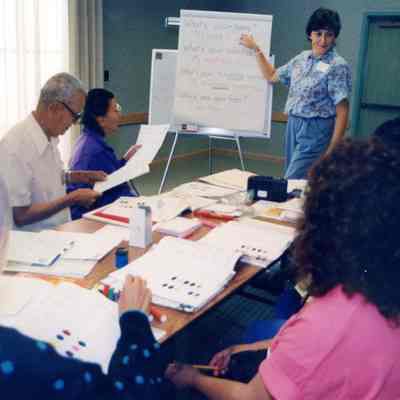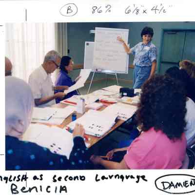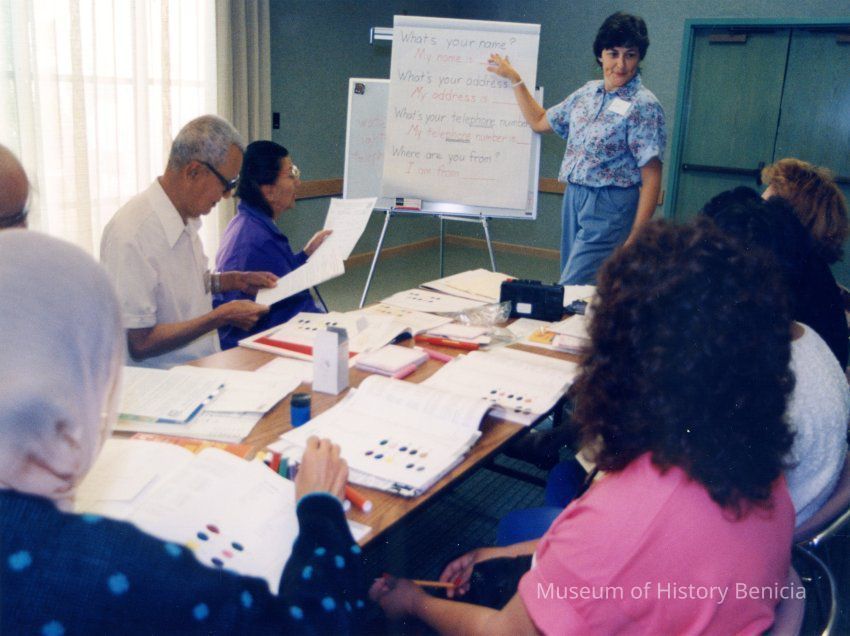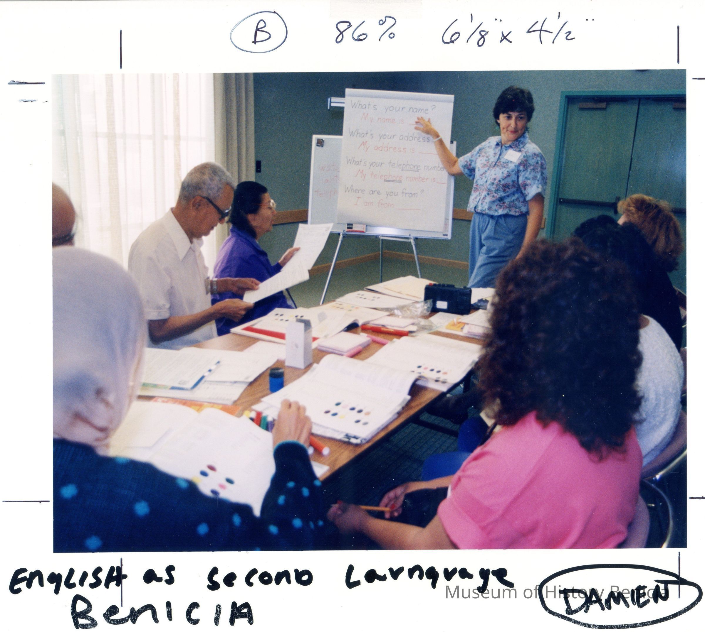 Color photograph of a group of people around a table. A woman is standing next to an easel on which is a large pad of paper. They appear to be in the middle of a lesson. The caption reads "English as second language, Benicia".Collection