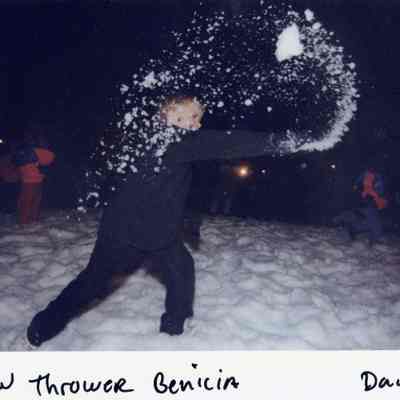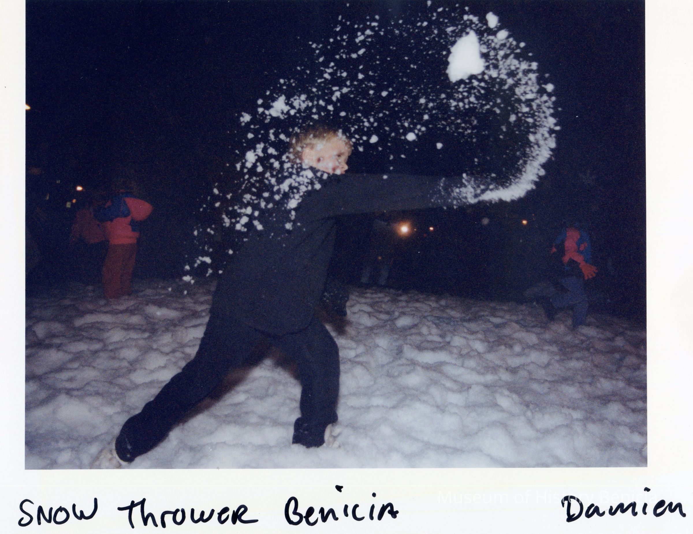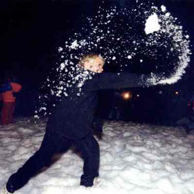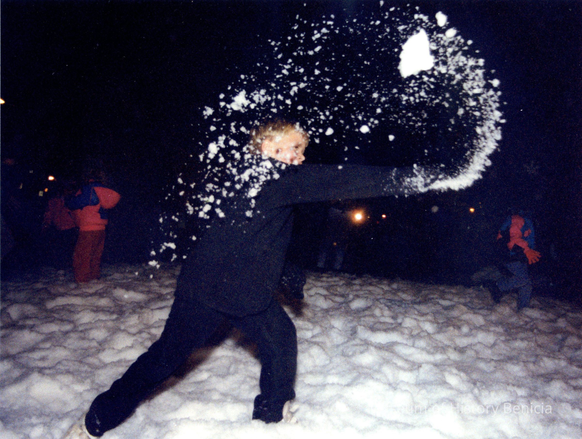 Color photograph of a child throwing snow on the lawn of the capitol building at night.
