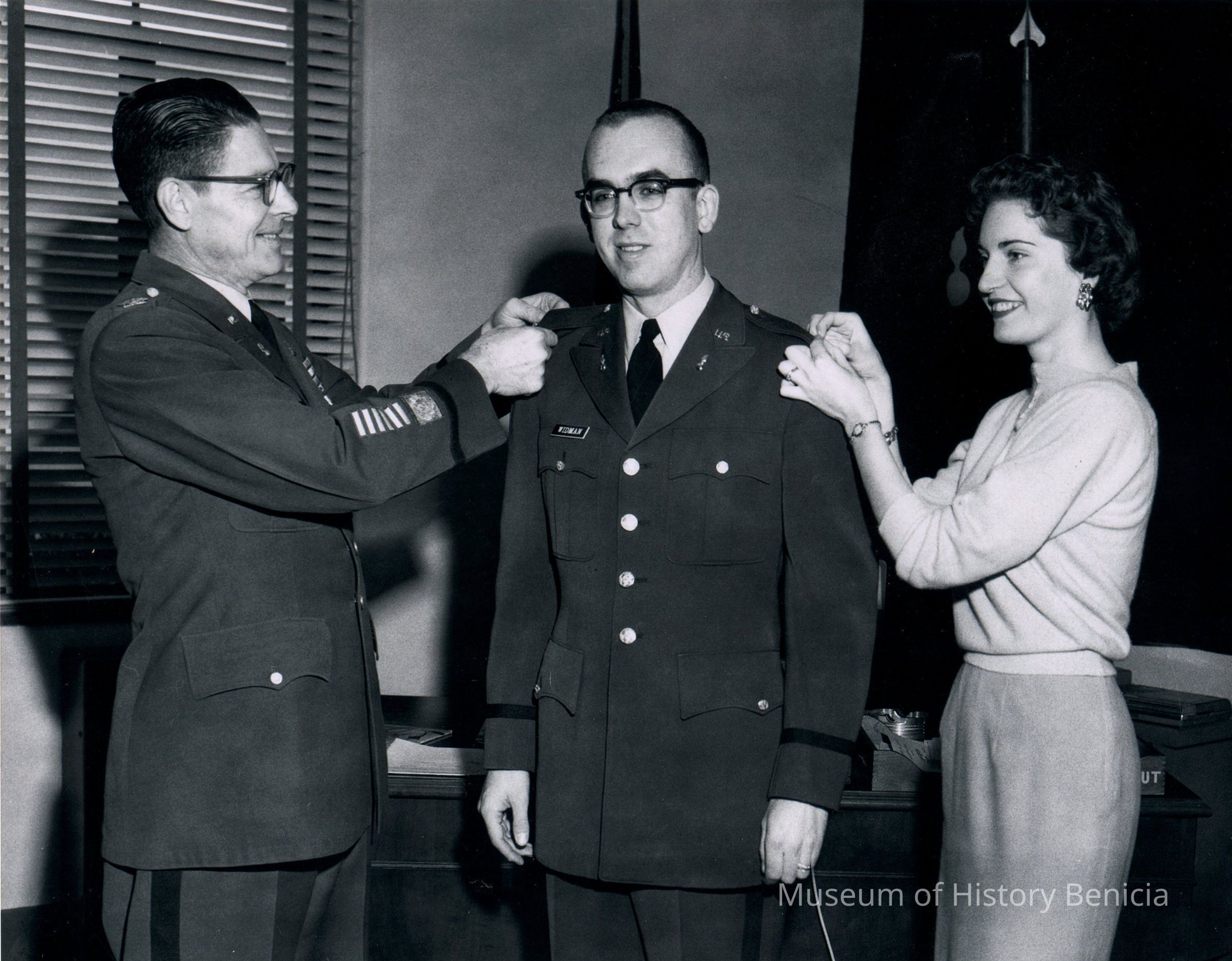 B/W photograph of promotion of Gary Widman from 2nd Lt. to 1st Lt. by Col. Moats, Commanding Officer of Benicia Arsenal. The Silver Bars are also being pinned on by Mrs. Jean Jurgens Widman, who worked for State Senator Luther Gibson. The photo was taken in February 1959. Lt Widman was 22 years old at the time.Collection