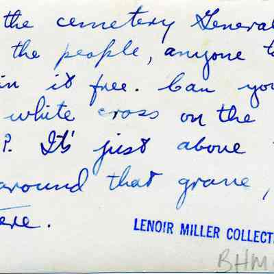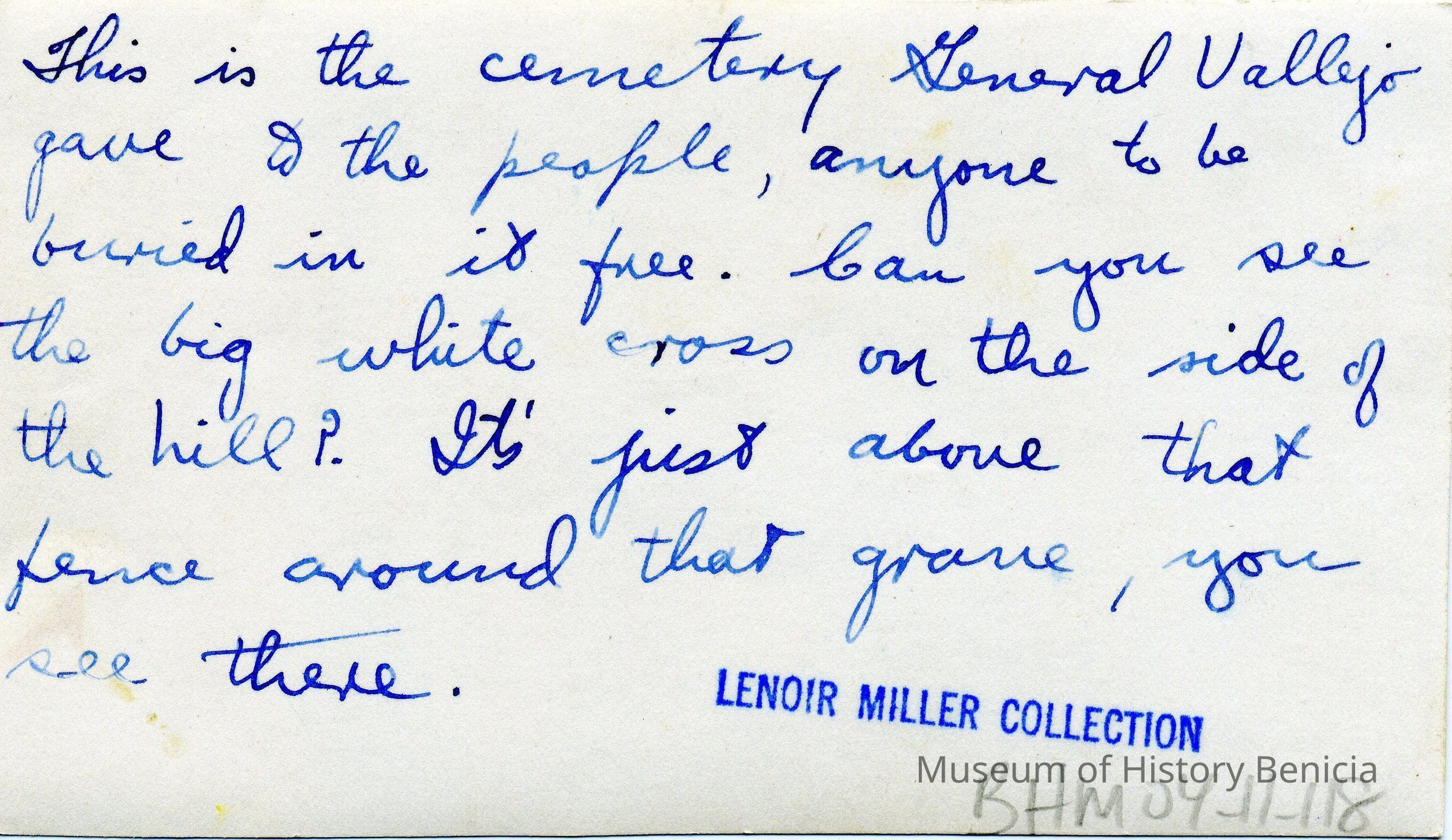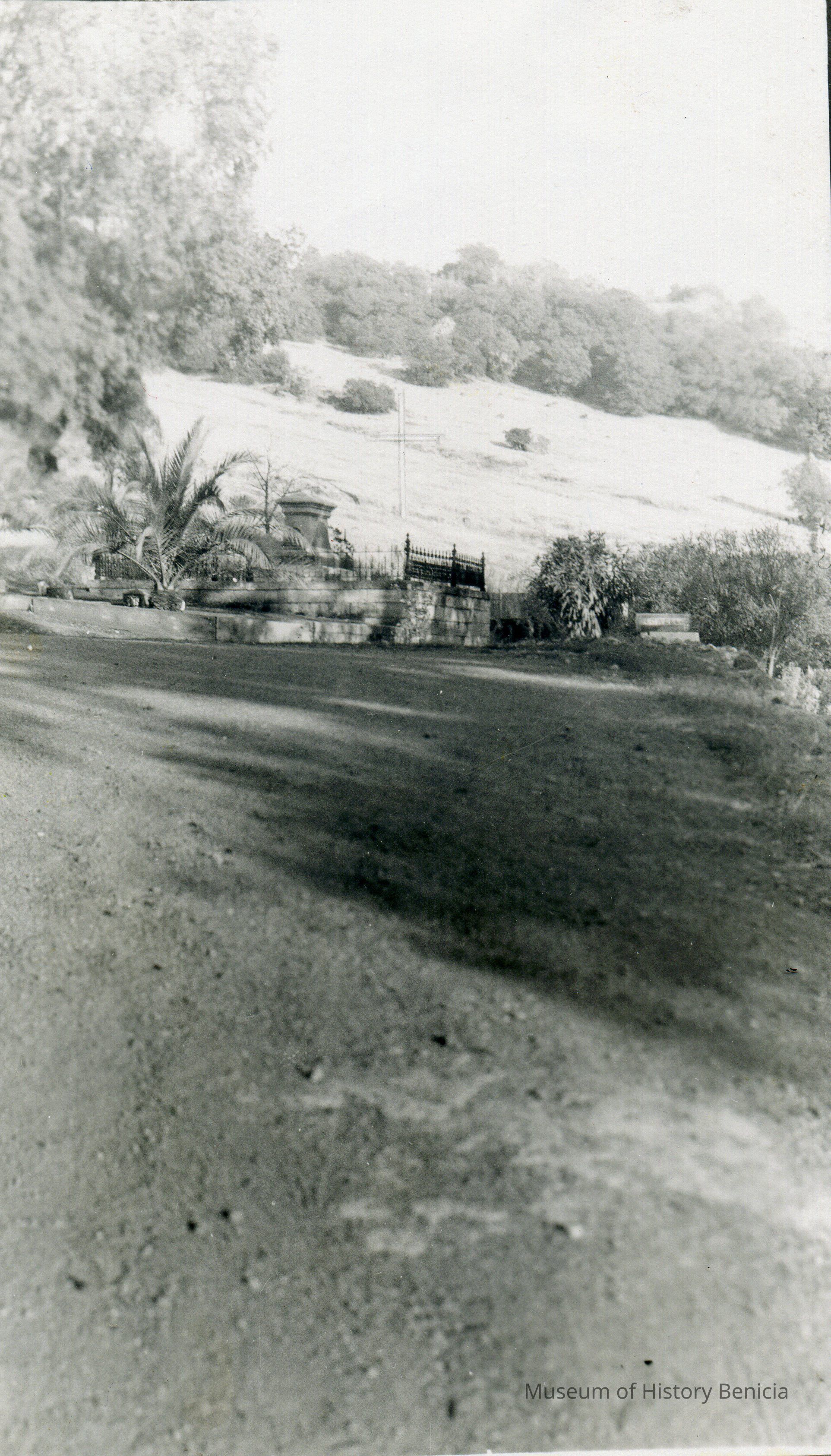 B/W photograph with this written in blue ink on the back of the photo: "This is the cemetery General Vallejo gave to the people, anyone to be buried in it free. Can you see the big white cross on the side of the hill? It's just above that fence around that grave, you see there." That was most likely written by Lenoir Miller, former library at the Benicia Public Library.Collection