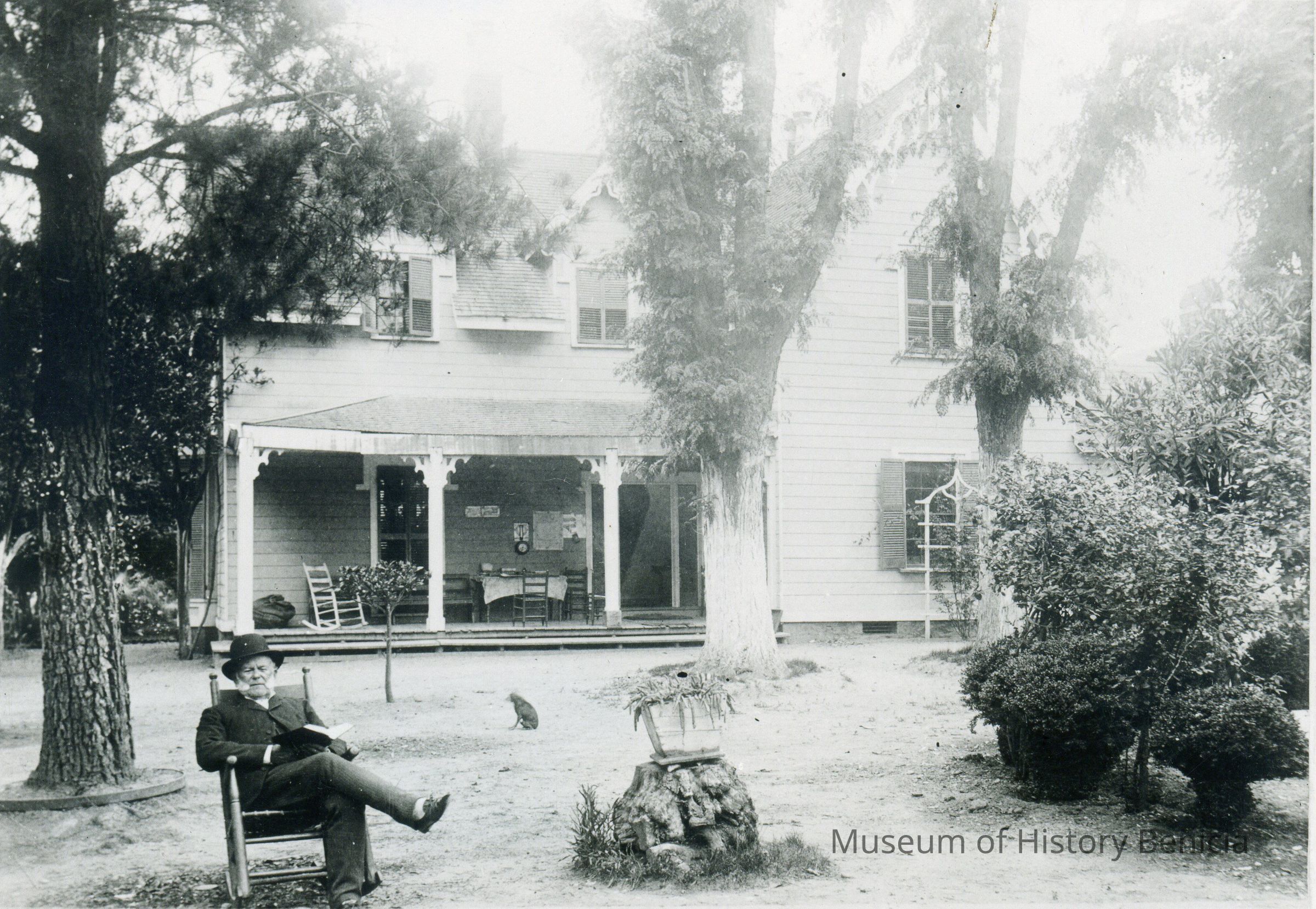 B/W photograph of General Vallejo sitting in a rocking chair, holding a book, in the garden of his home, Lachryma Montis about 1888.