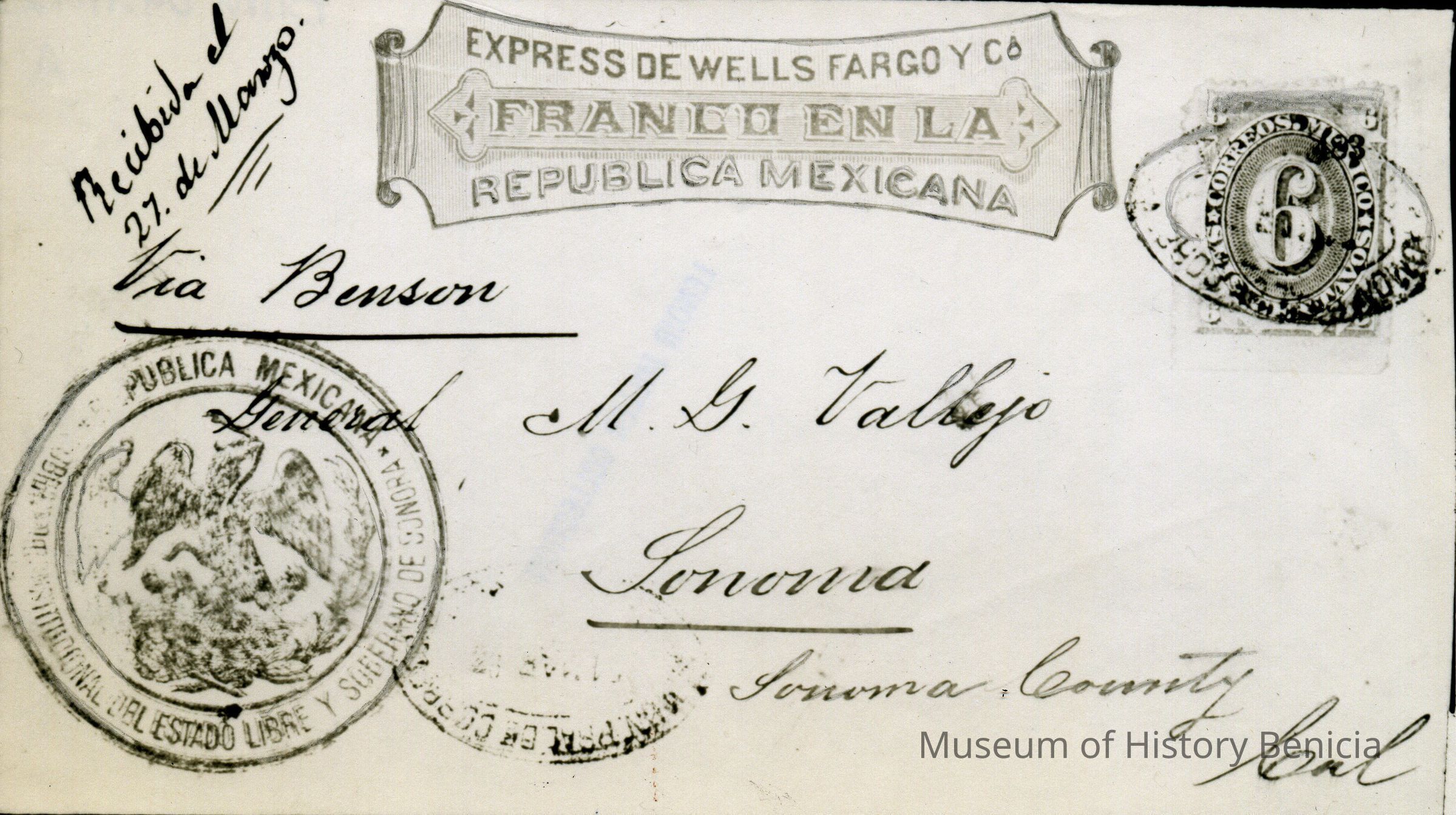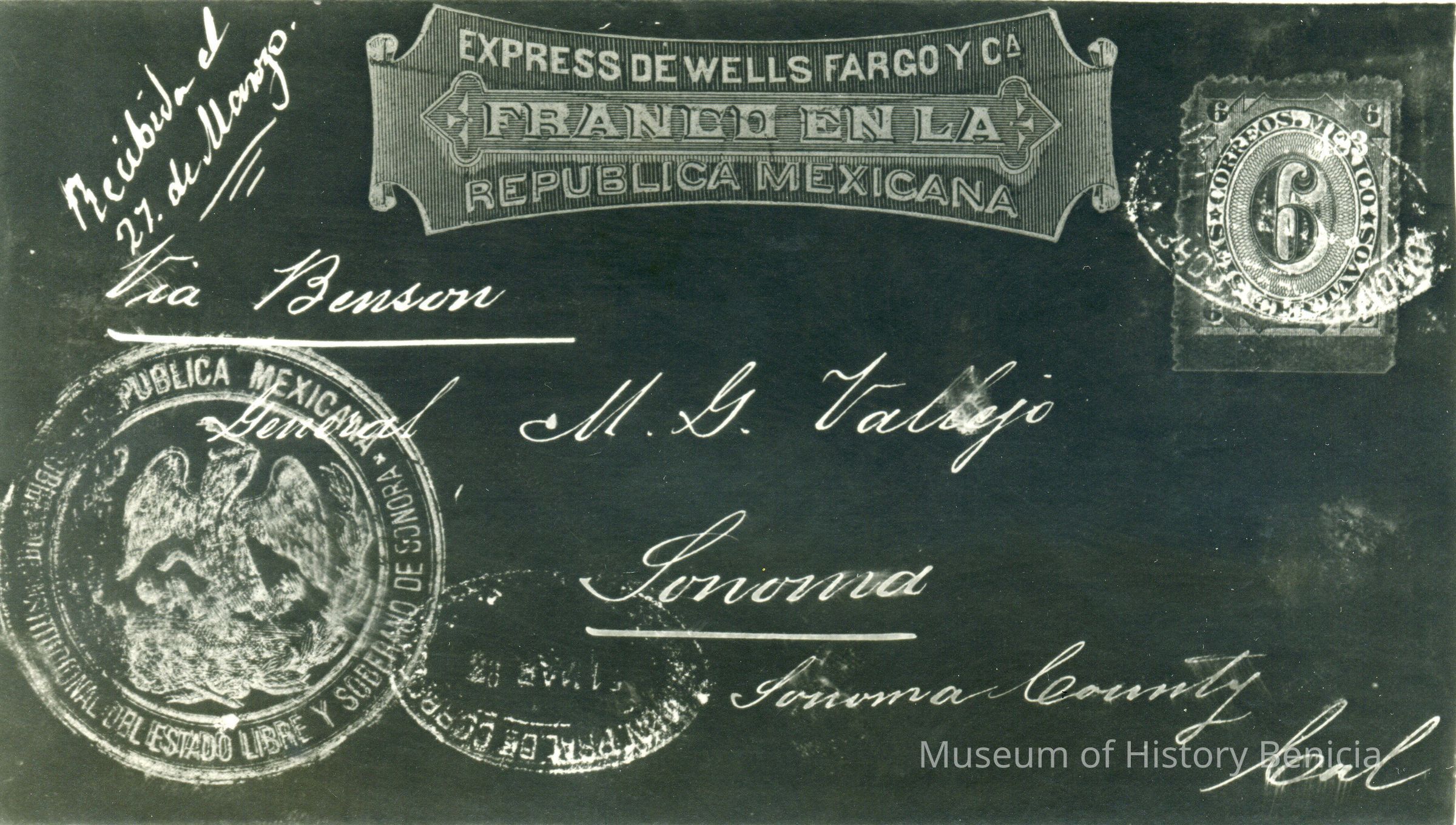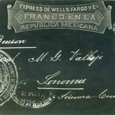 B/W copies (2) of what appears to be the address side of a postcard sent to General Vallejo from Mexico. One copy is dark print w/white background, the other is white print w/black background. They appear to be identical. Some of the writing and imprints are in Spanish.Collection