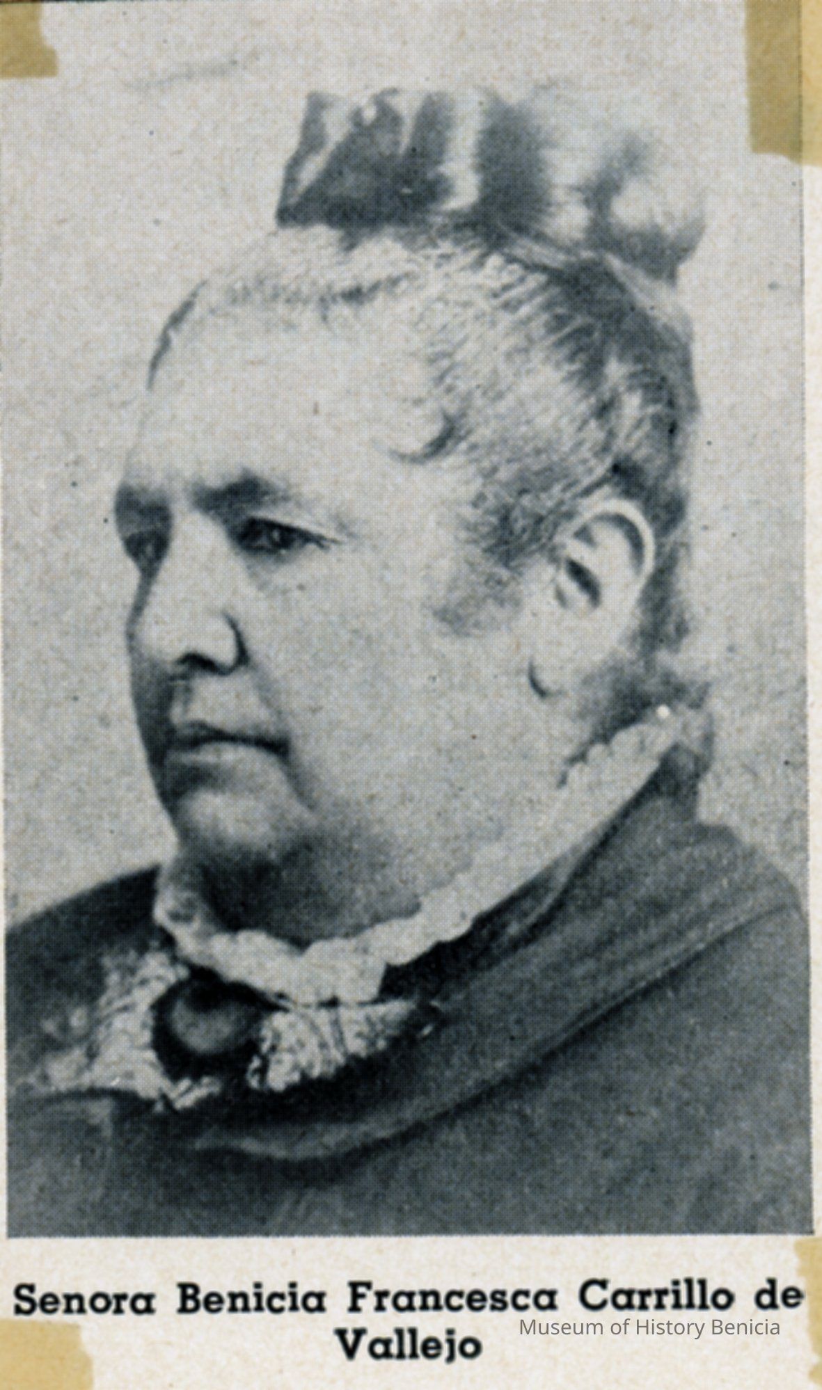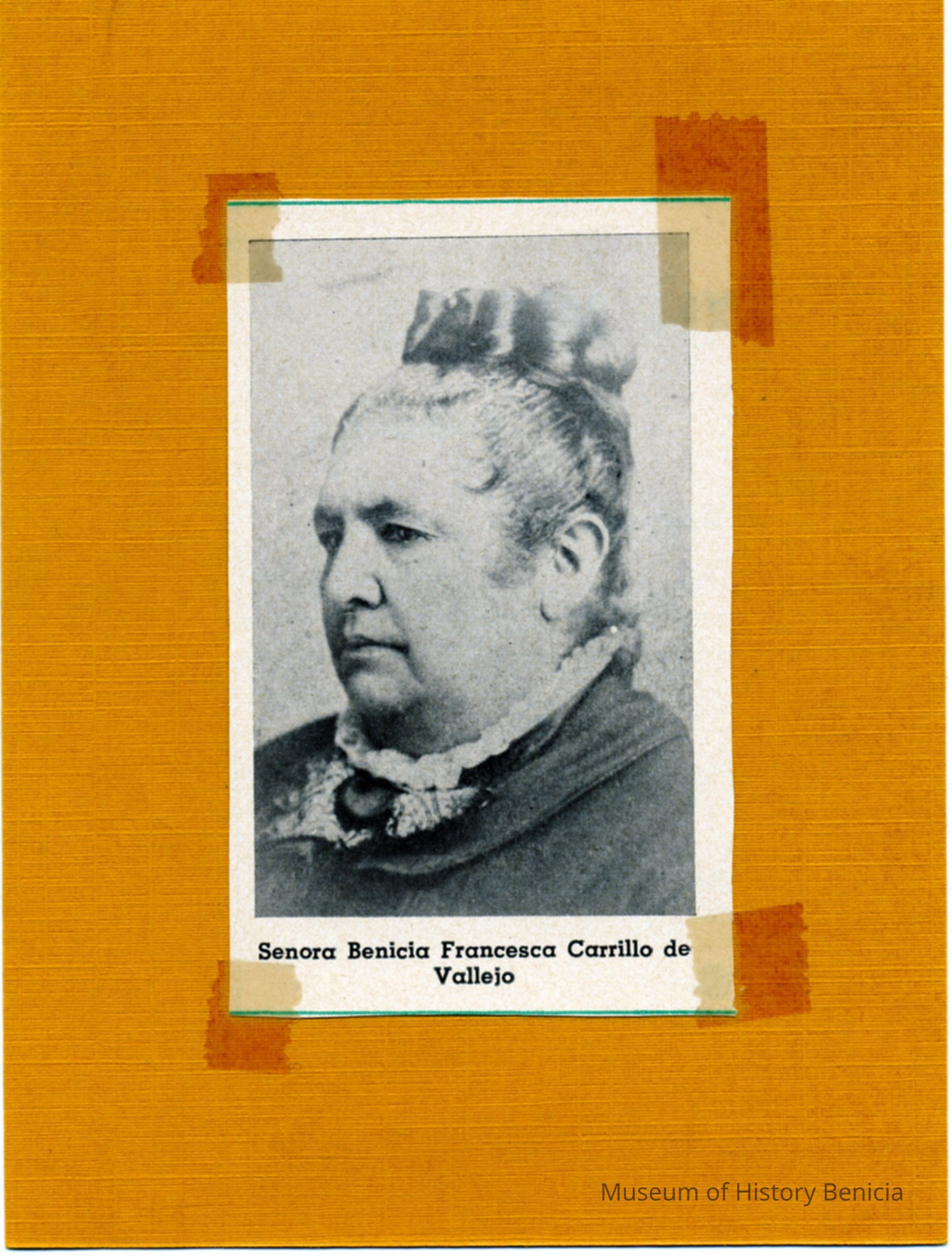 B/W photograph ( 2-1/4"x3-5/8") cut from a book or magazine and taped on a background (5-1/2"x4-1/4"). The photograph is of Senora Benicia Francesca Carrillo de Vallejo.Collection