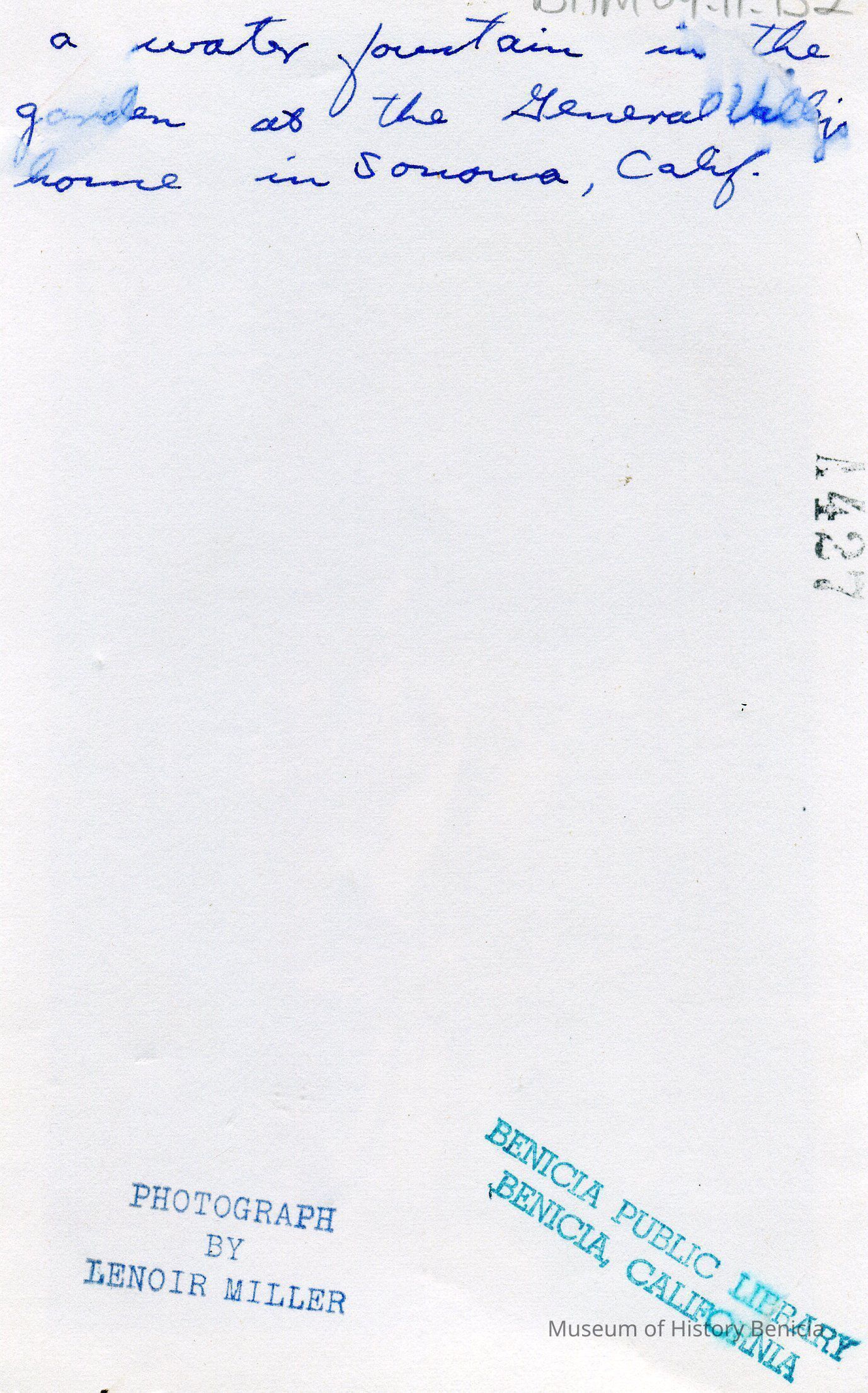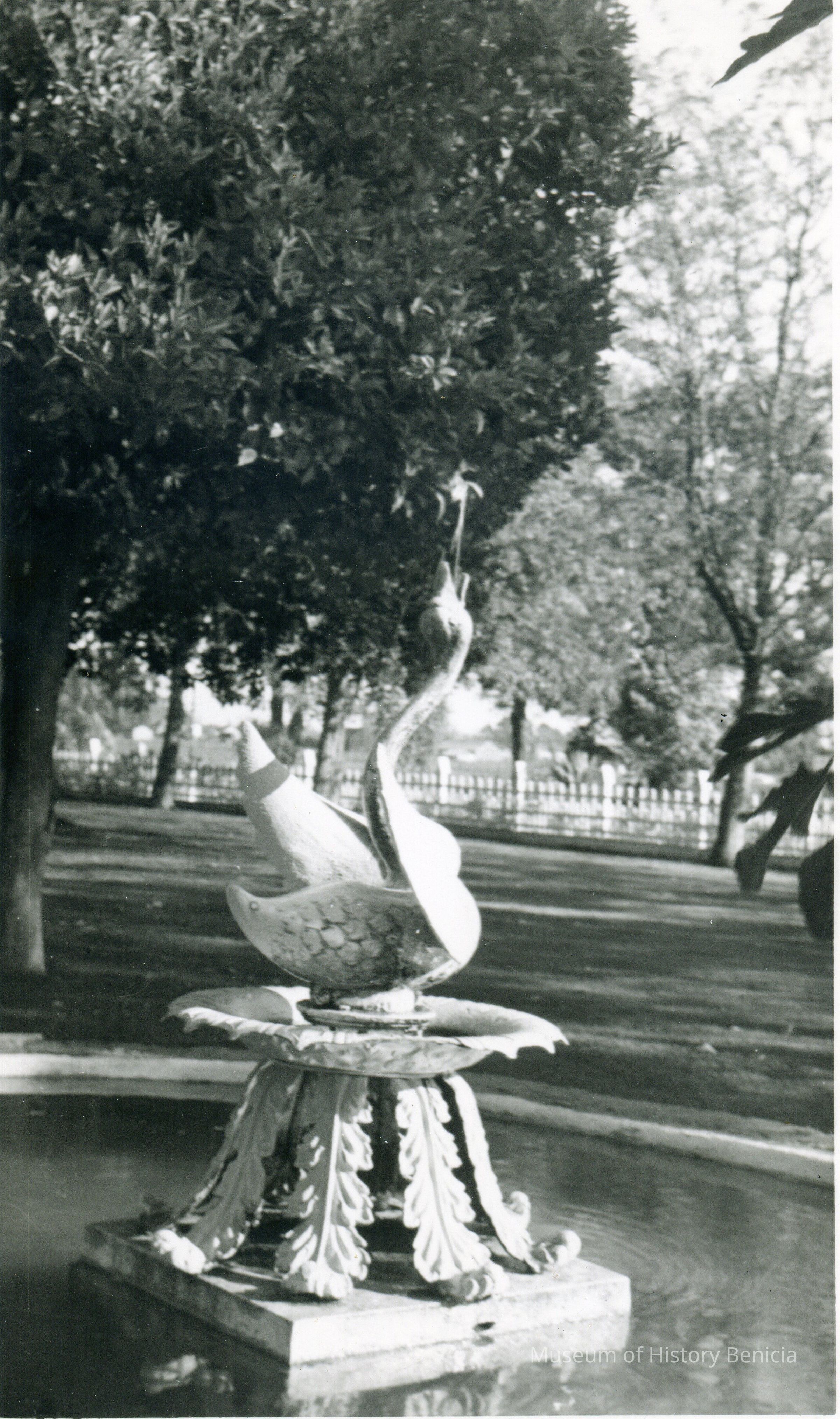 B/w photograph of a water fountain in the garden of General Vallejo's house in Sonoma, California. The Lenoir Miller Collection.